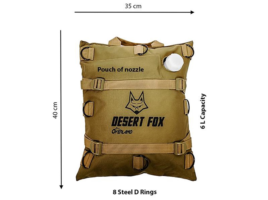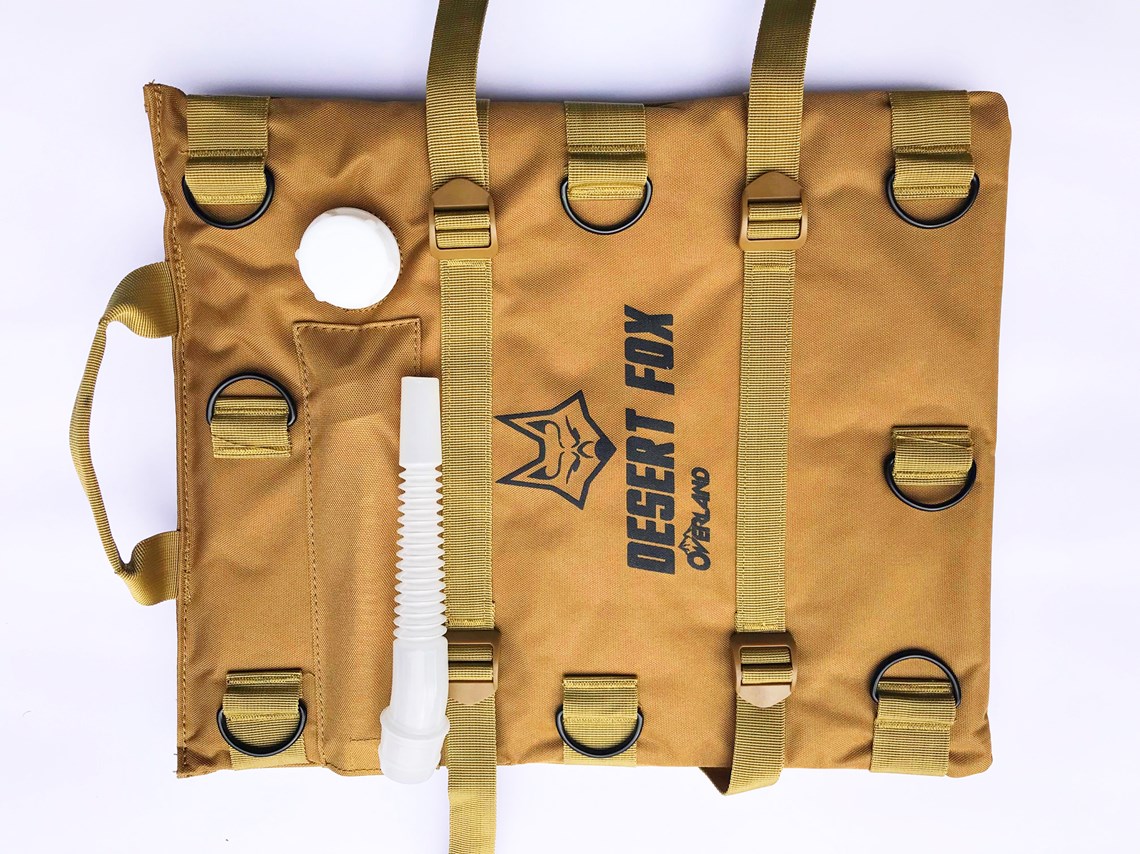 The Desert Fox 6 litre flexible motorcycle fuel bladder easily folds away when not required and includes a handy spout for refuelling..