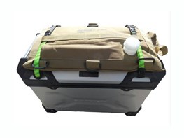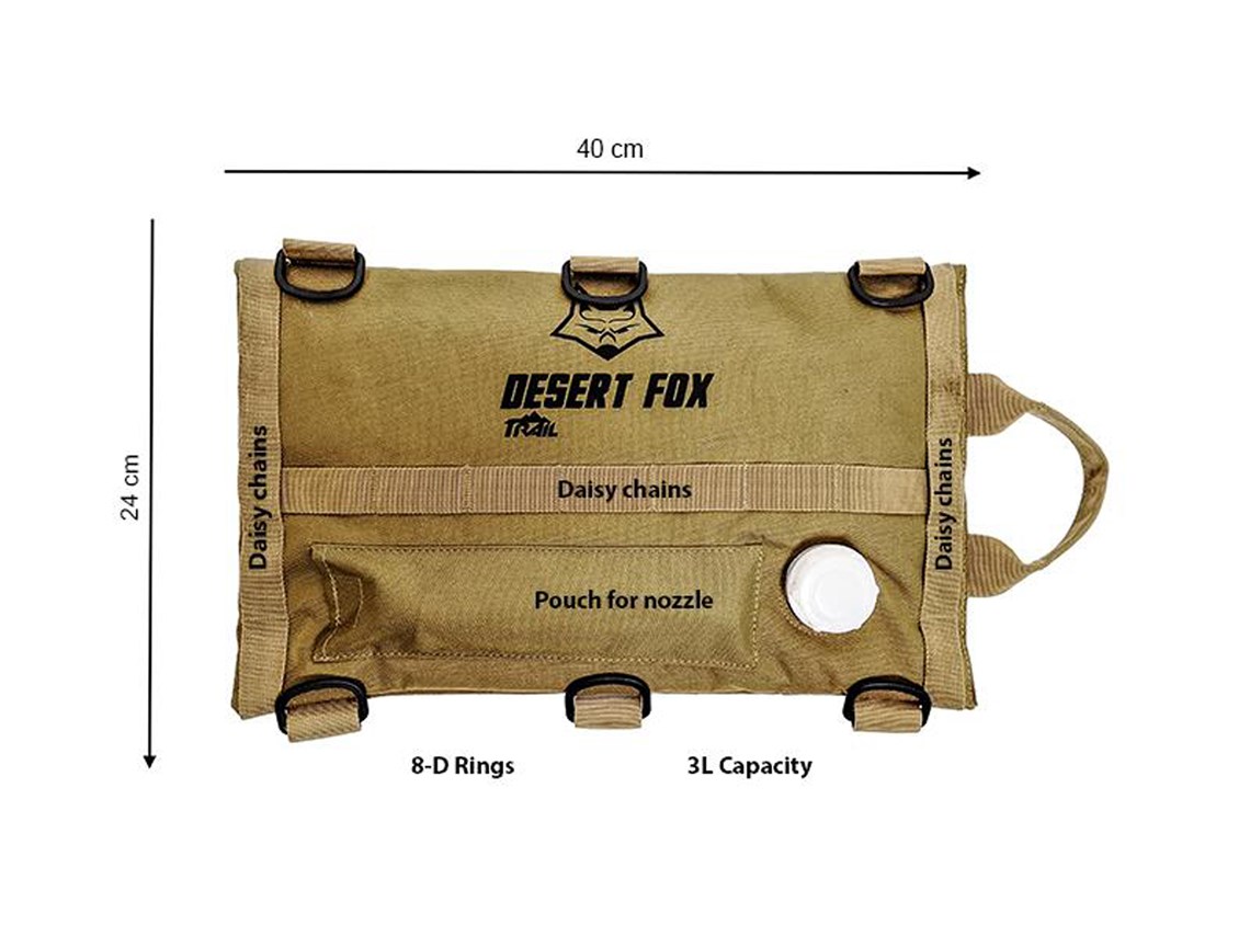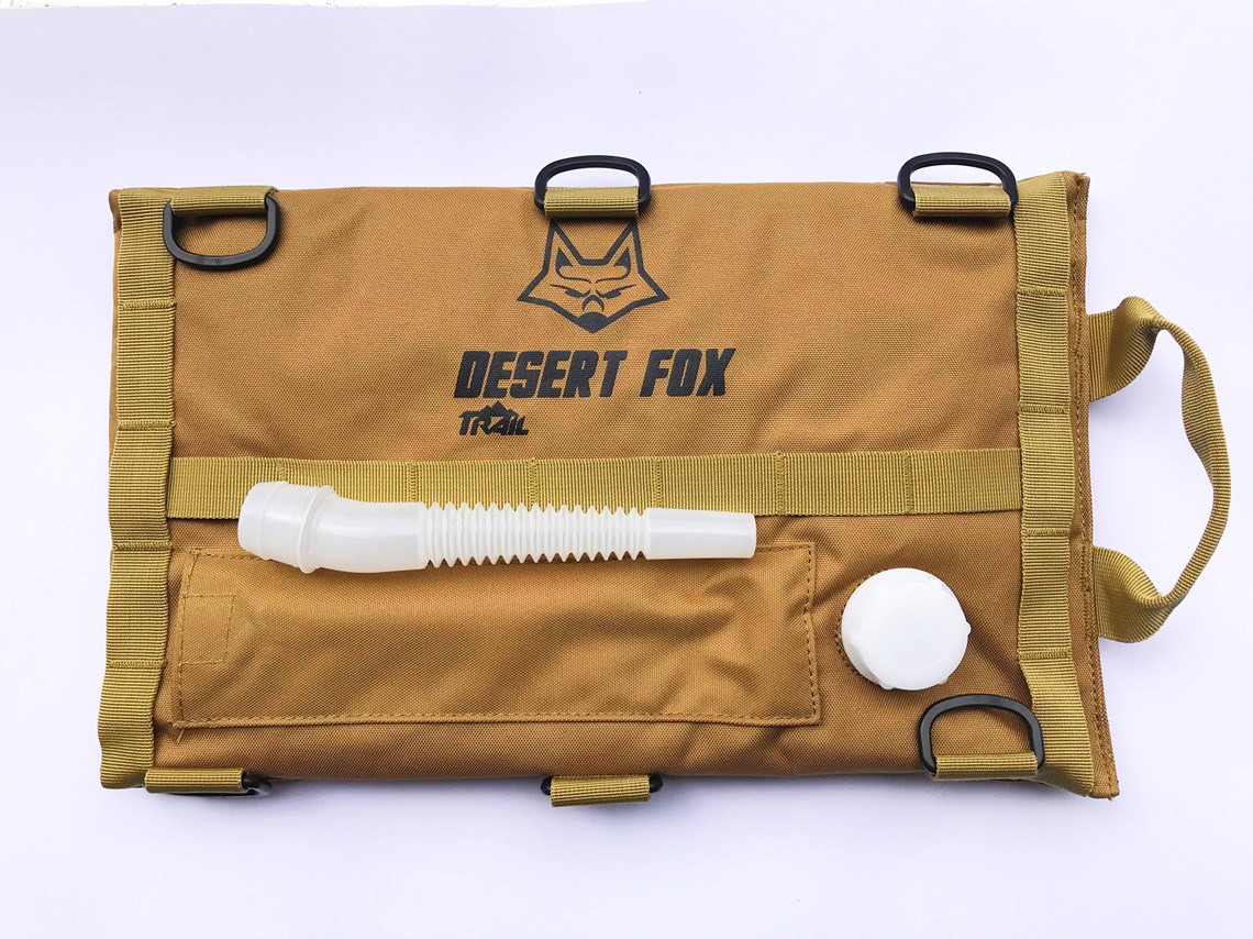 The Desert Fox 3 litre flexible motorcycle fuel bladder easily folds away when not required and includes a handy spout for re-fuelling.