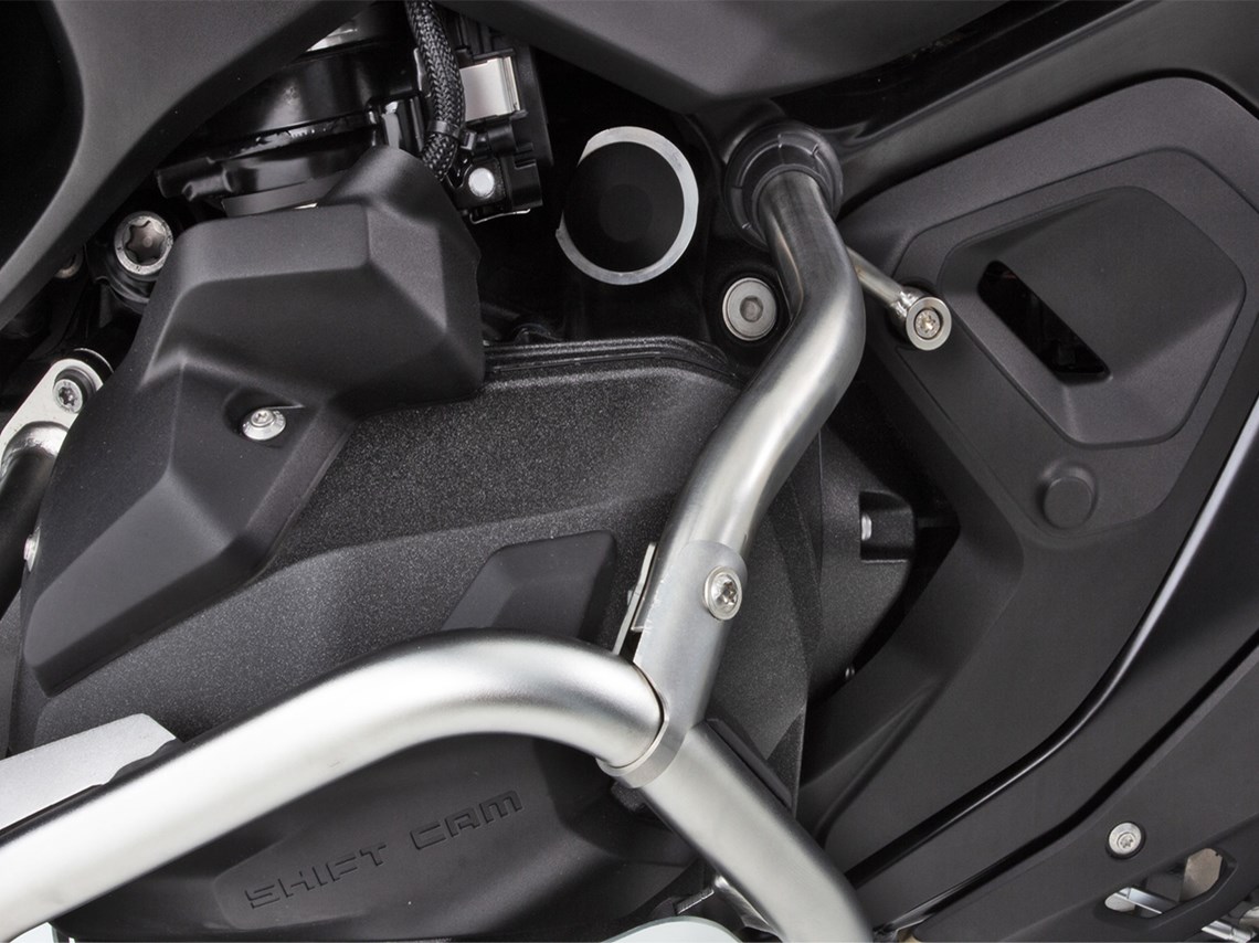 The Wunderlich reinforcement struts complement the original engine protection bar and offer solid extra protection for the flanks of the R1300GS, R1300 Adventure
