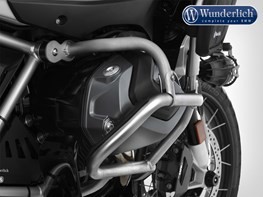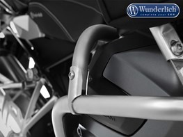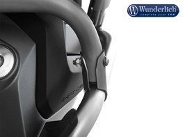 The Wunderlich reinforcement bar reliably resolves this problem. It connects the rear free end of the engine protection bar to the frame. This means the effective forces are also transferred via the bar to the suitable points on the frame structure. This measure therefore prevents the engine protection bar giving way and reduces the risk of damage to the valve cover. The construction of the reinforcement bar is designed so that its curving form ensures the dissipation of load spikes.@