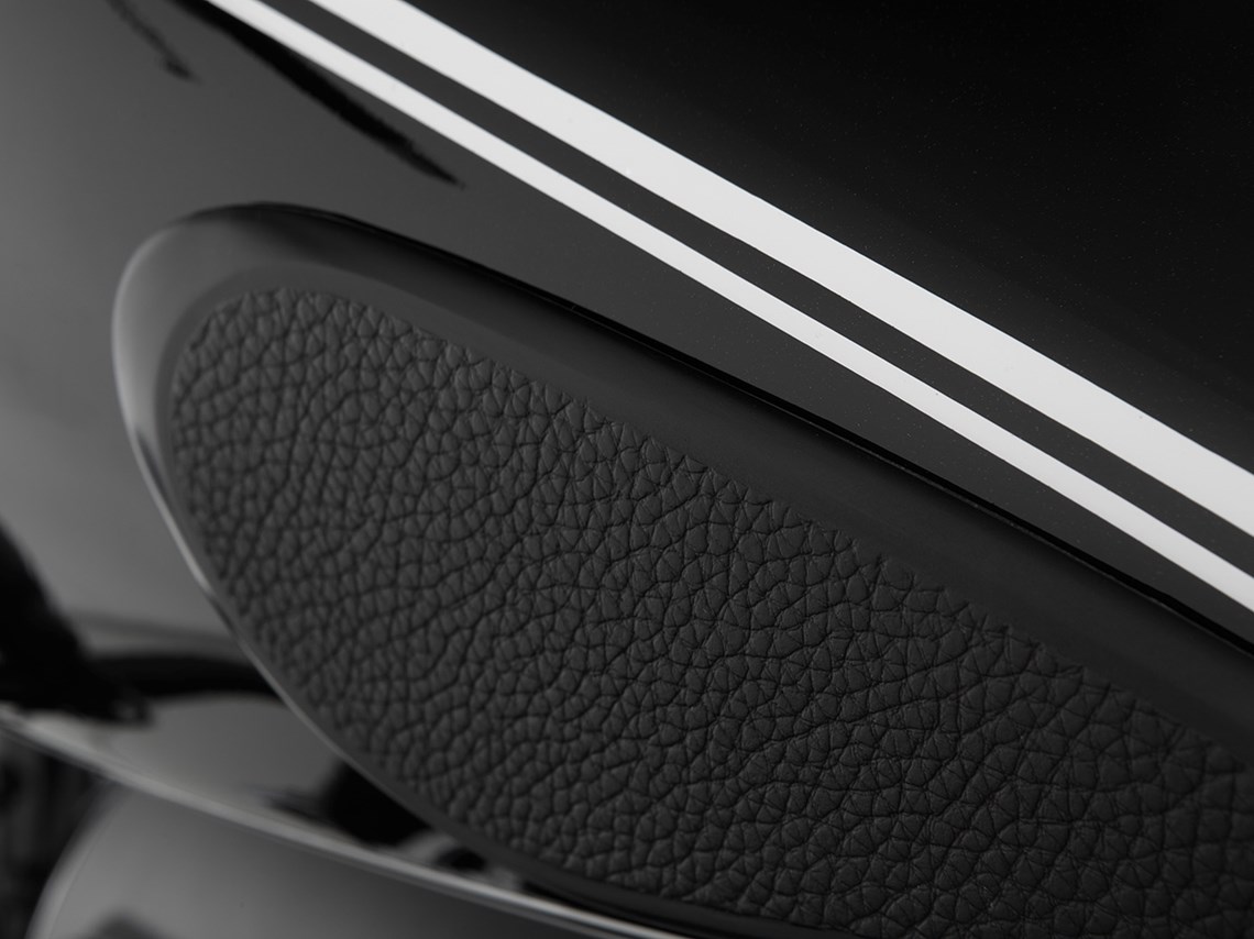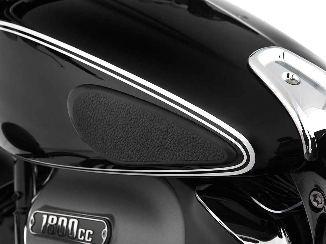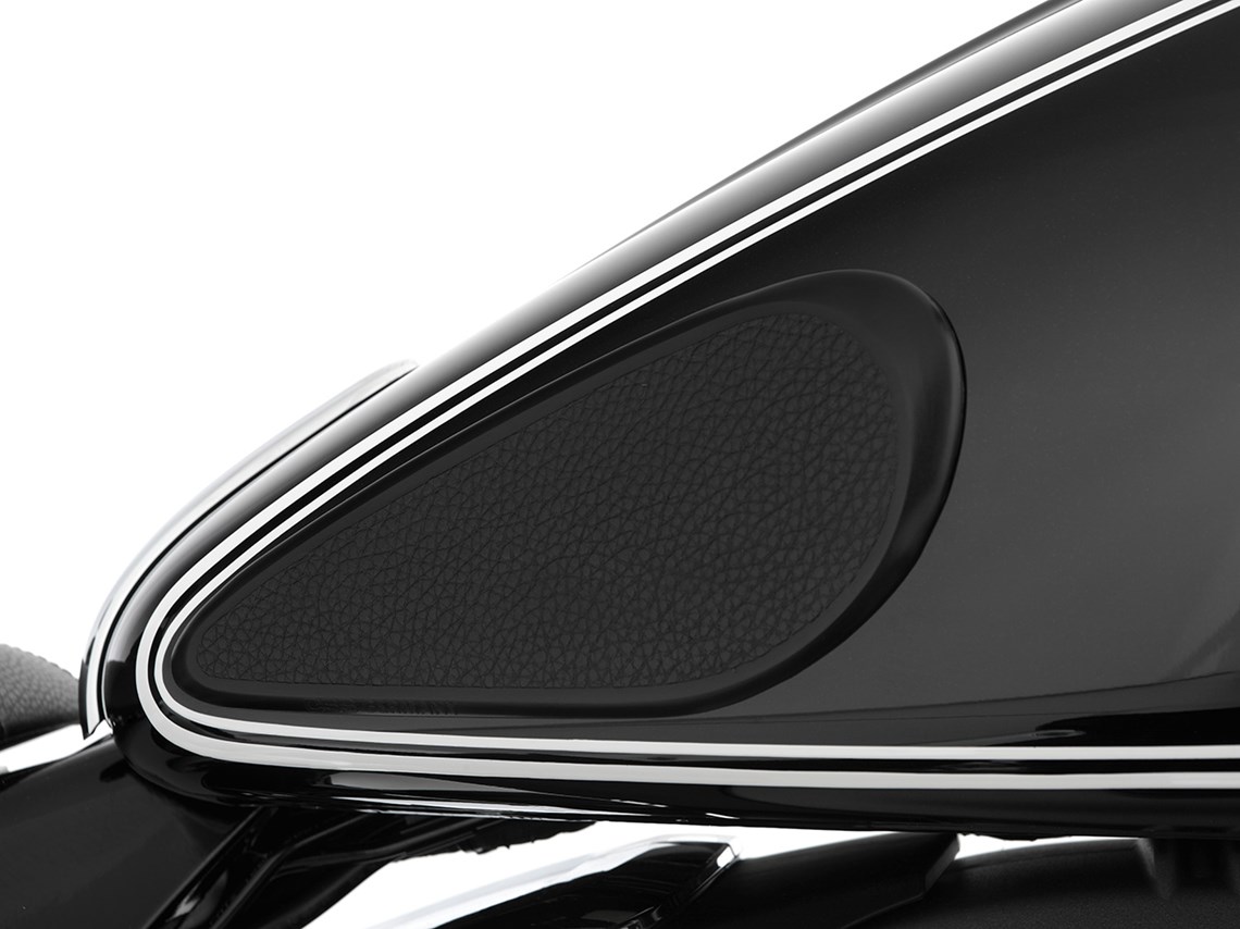 The two-part tank pad kit is precisely tailored to the design of the cruiser. The pads effectively protect all contact points on the tank from scratches, chafing or abrasion. At the same time, they improve the knee grip and convey noticeably better contact with the motorcycle when driving due to the increased grip. This significantly increases the driving experience and driving pleasure. The material consists of high-quality, non-slip, black plastic that is shock-absorbing and has a slightly grained texture. The pads are self-adhesive and easy to apply.