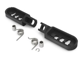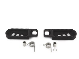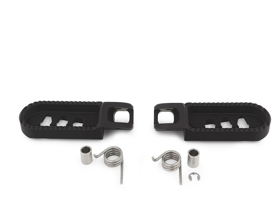 These footrests are a part of our “Ergo” program of handle bar risers, seats and adjustable control levers, with which we are providing the components for each rider to “fine-tune” the riding position and posture to his or her own personal needs. For these models we wanted a better knee angle, but without having to move the feet outwards. To achieve this we had to make a completely new footrest. The footrest is made of high quality aluminium and will withstand the highest loads. For better comfort the original rubber footrest insert can be used.