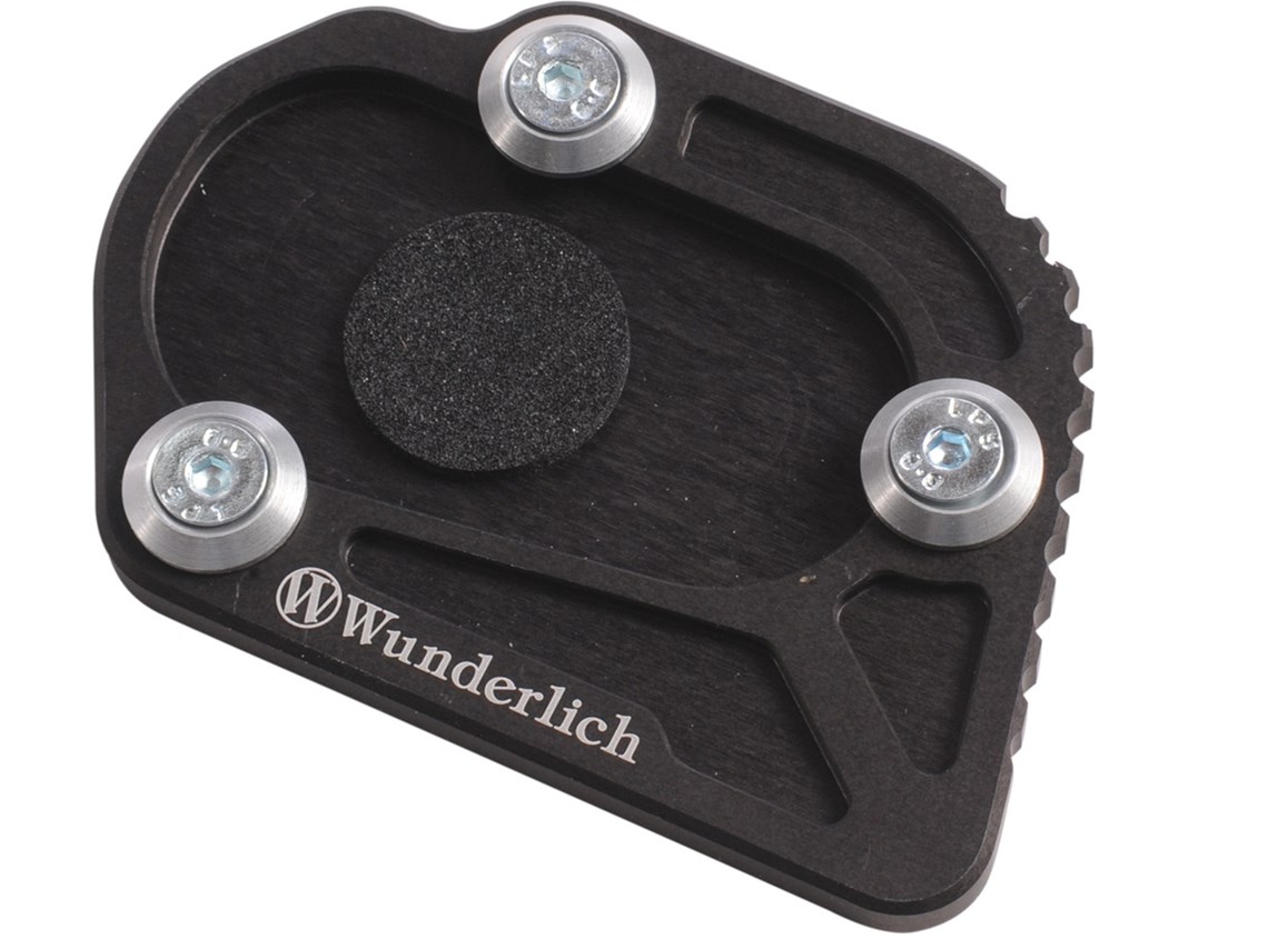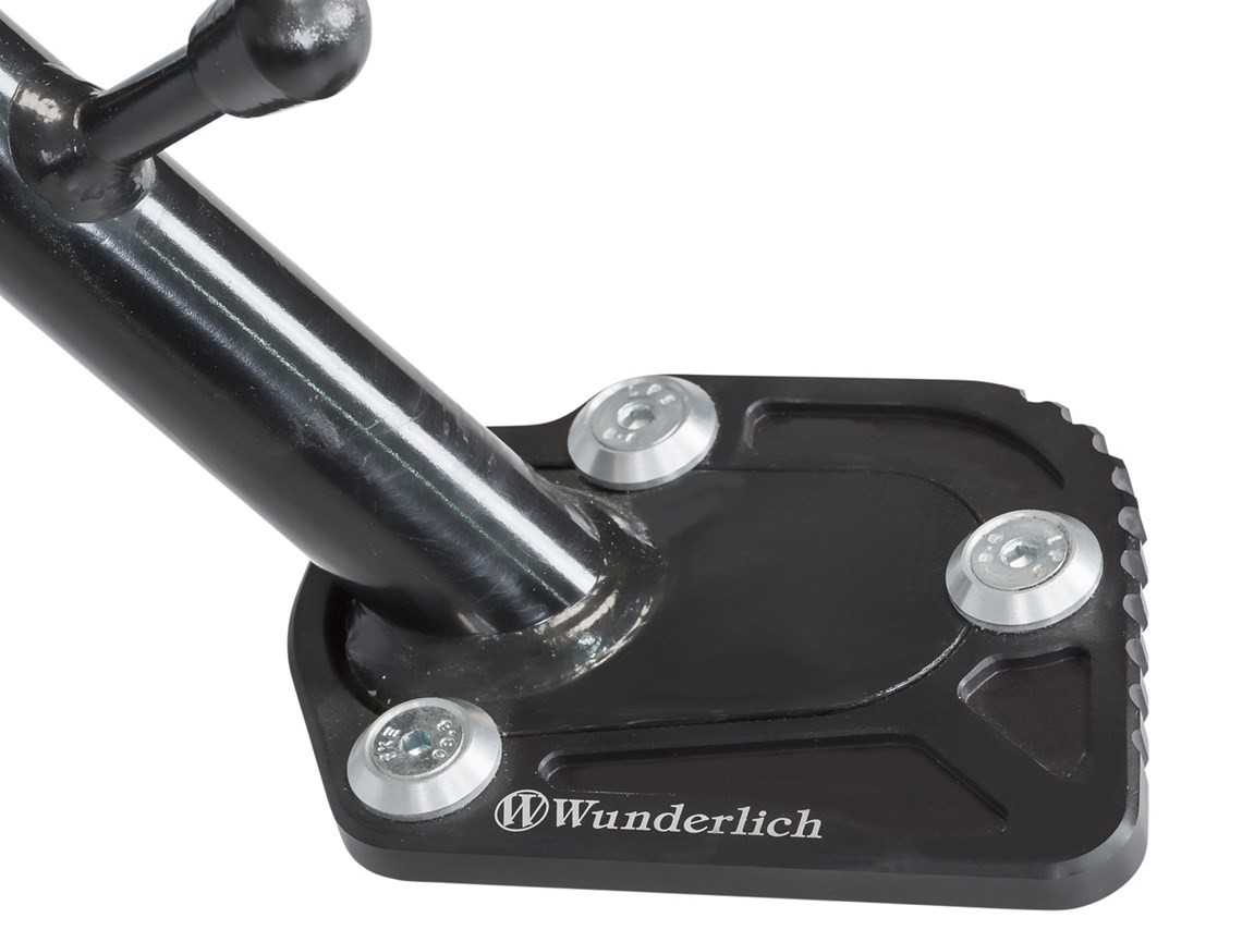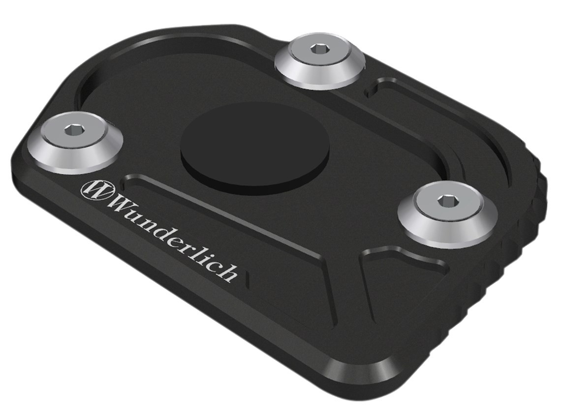 Precision machined enlarger plate is manufactured from 8mm thick aluminium alloy. The shape of the side stand enlarger is designed so that the stand will still fold away as before, but the area of the stand is INCREASED BY 100%.