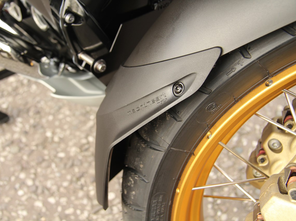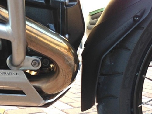 The front fender of the 2013 R1200GS_LC is both shorter and pointier at its trailing edge than the previous generation GS making the exposed painted surface of the front engine case even more vulnerable to stone damage.
