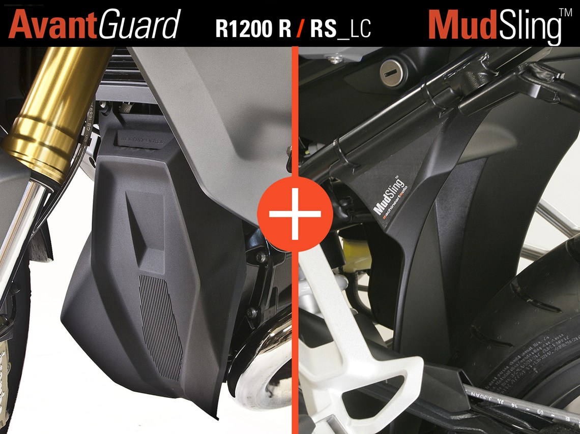 The Avant Guard is a front end stone and splash guard that protects the painted engine and exhaust headers of the liquid-cooled BMW R1200R/RS, R1250R/RS from serious and costly abrasion damage. The Avant Guard is a new kind of protection product designed to reflect these bikes distinctive styling while taking over the function of a front mudguard extender.