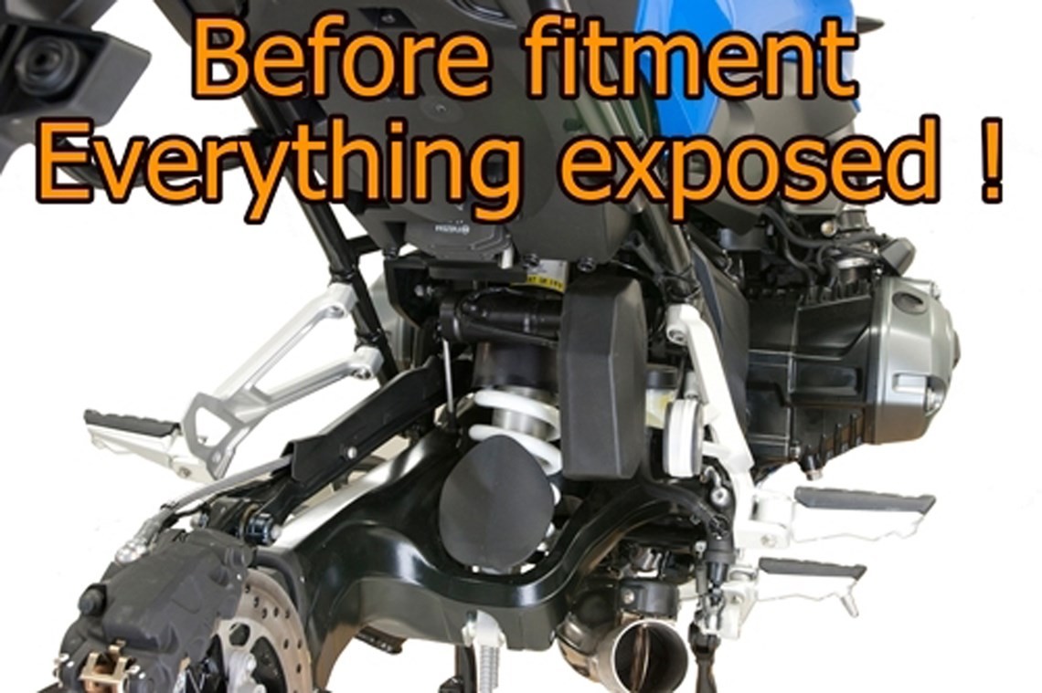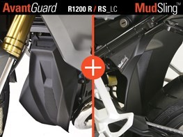 BMW have provided a minimal rear mudguard for these models but it is insufficiently long and wide to capture mud and water spray thrown forward onto the suspension and to the sides onto riders legs. The new MudSling for the R1200R/RS_LC/1250R/1250RS protects these models' wide open suspension area and assorted under seat electronics modules from stone chips, rain, and mud accumulation. Its effective coverage area is 136 sq.in., 8.5 wide and 16 long to protect the Paralever arm. That provides broad area coverage forward of the tyre where none existed before, while from the side the MudSling's design is slender and well integrated with the bike’s form.