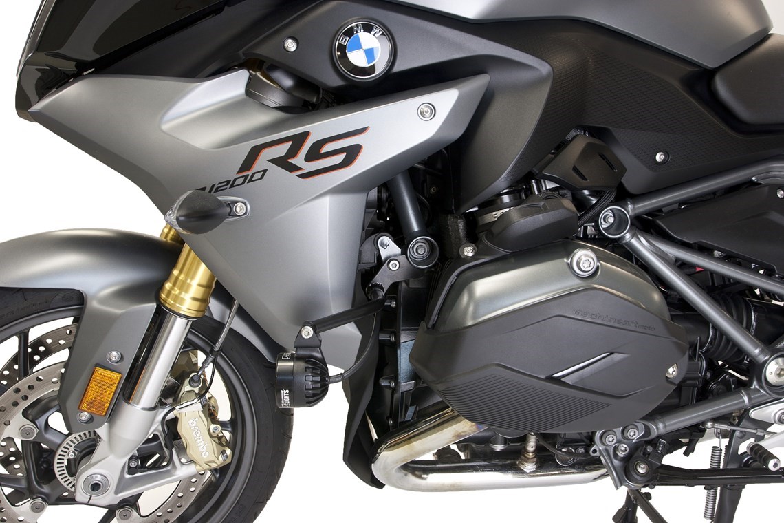 MachineArt Light Bars enable the fitting of the AvantGuard engine protection shield (part number MAM-AVG-RRS) to the R1200R LC and RS LC along with LED driving lights, either those from BMW or aftermarket brands such as Clearwater, whose Darla model is shown here. The MachineArt light bars are cheaper than the BMW light bars which do not fit with the AvantGuard.