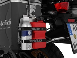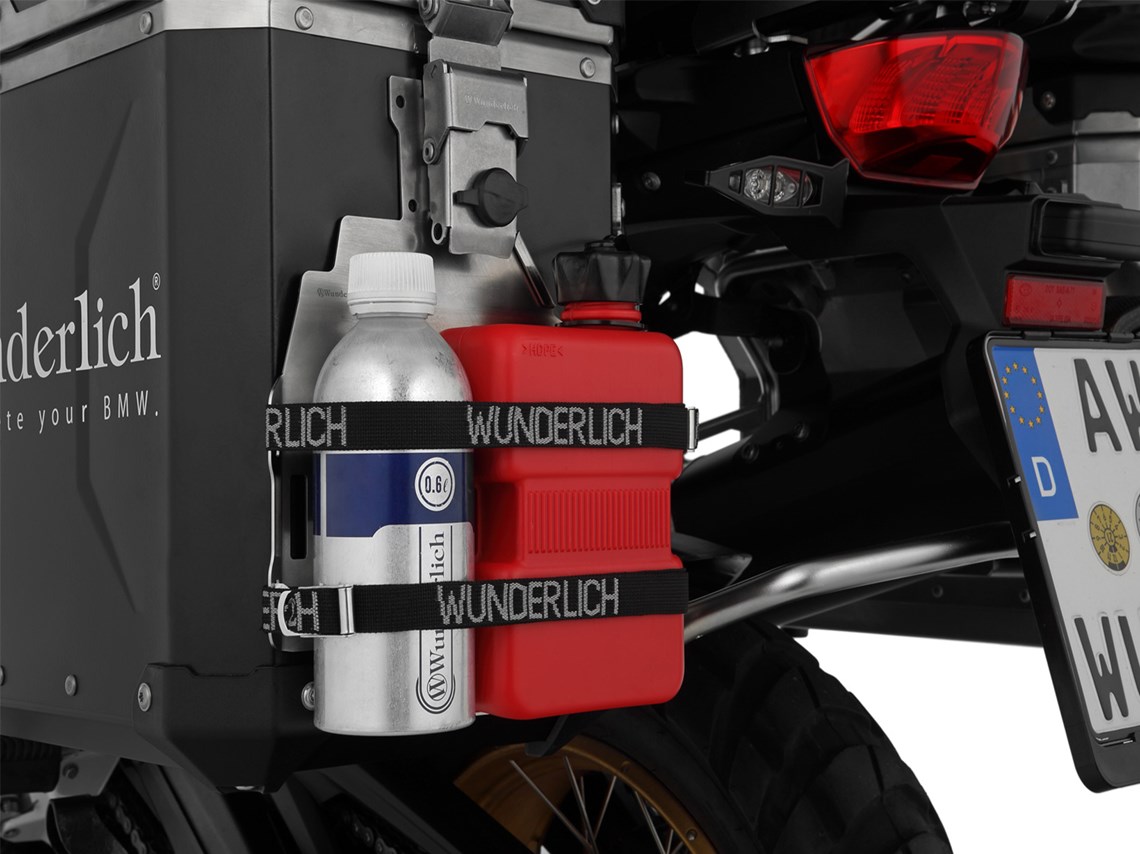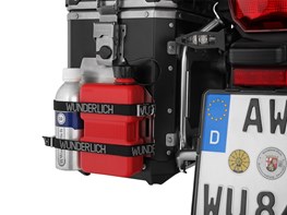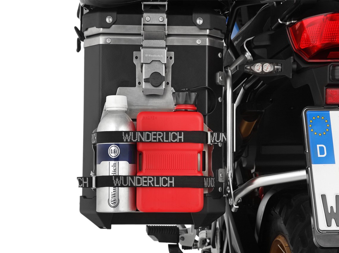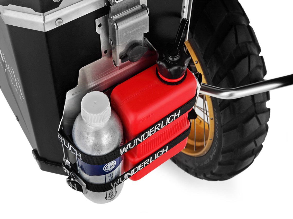 The Wunderlich pannier rack is the perfect addition to the pannier for everything that either needs to be quickly at hand or has no place in the suitcase. It takes the common travel canisters for gasoline, oil bottles as well as compact storage canisters for water or other travel utensils. Who does not know the annoying circumstances when liquids leak - especially on the go. And the freed up suitcase volume can certainly be used for better things. The solid stainless steel rack is conveniently designed to hold two of our aluminium bottles (Art. No. 43583-000) next to each other. For example, oil and gasoline can be conveniently carried separately. It is secured using straps and the lashing openings integrated in the rack. Our practical straps (item no.