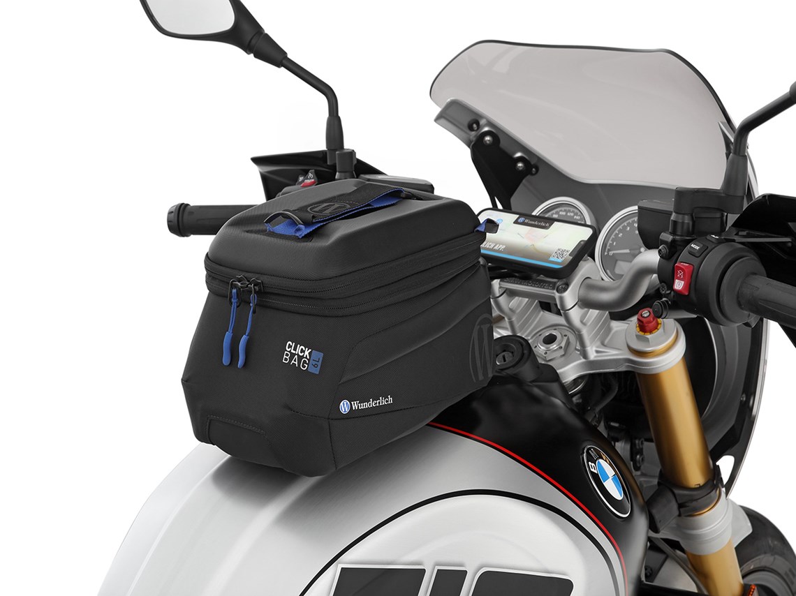 This Click Bag System tank bag offers you remarkably smart handling, because you can attach and detach it in no time at all - just with a click. The tank bags in the Wunderlich CLICK BAG series can be securely attached to the respective model specific tank ring (buy separately)