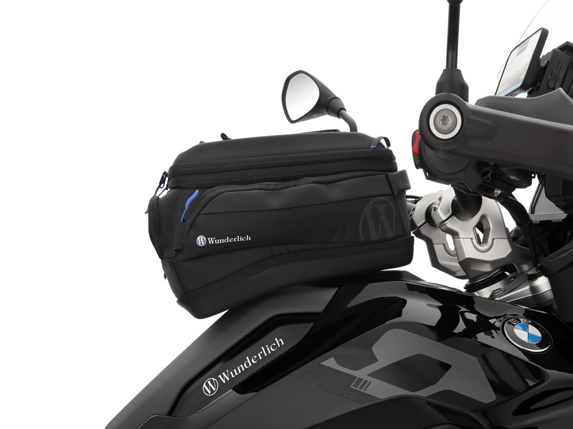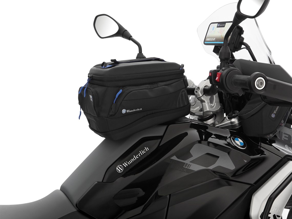 The Wunderlich Click System tank bag (11 litres expanding to 14 litres) can be fitted and removed in seconds and allows easy refuelling.