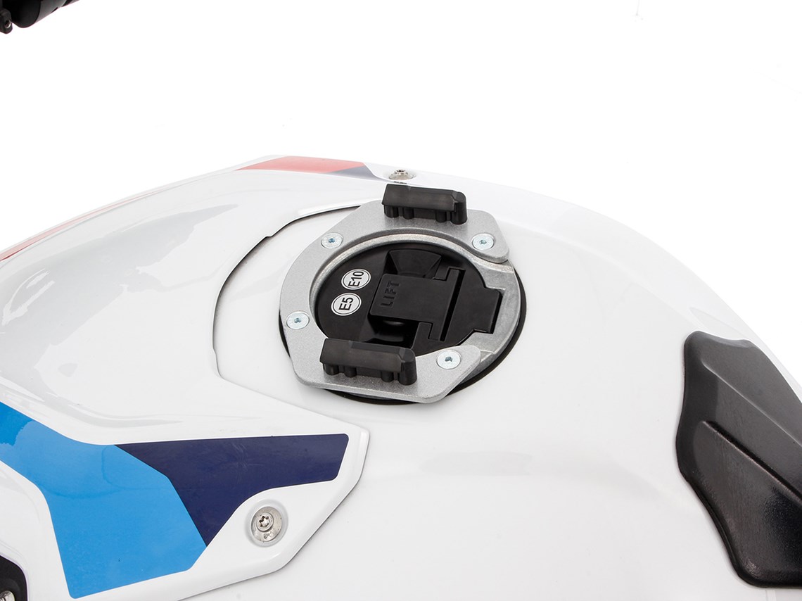 Model-specific Click System tank ring forms the solid basis for secure, mechanical locking of the Click System tank bag. To attach the Click System tank bag is inserted from above into the two guides of the tank ring until the lock closes automatically. With a strap on the tank bag, the lock can be released with a pull. In this way, the tank bag can be removed in no time at all - for example to refuel.