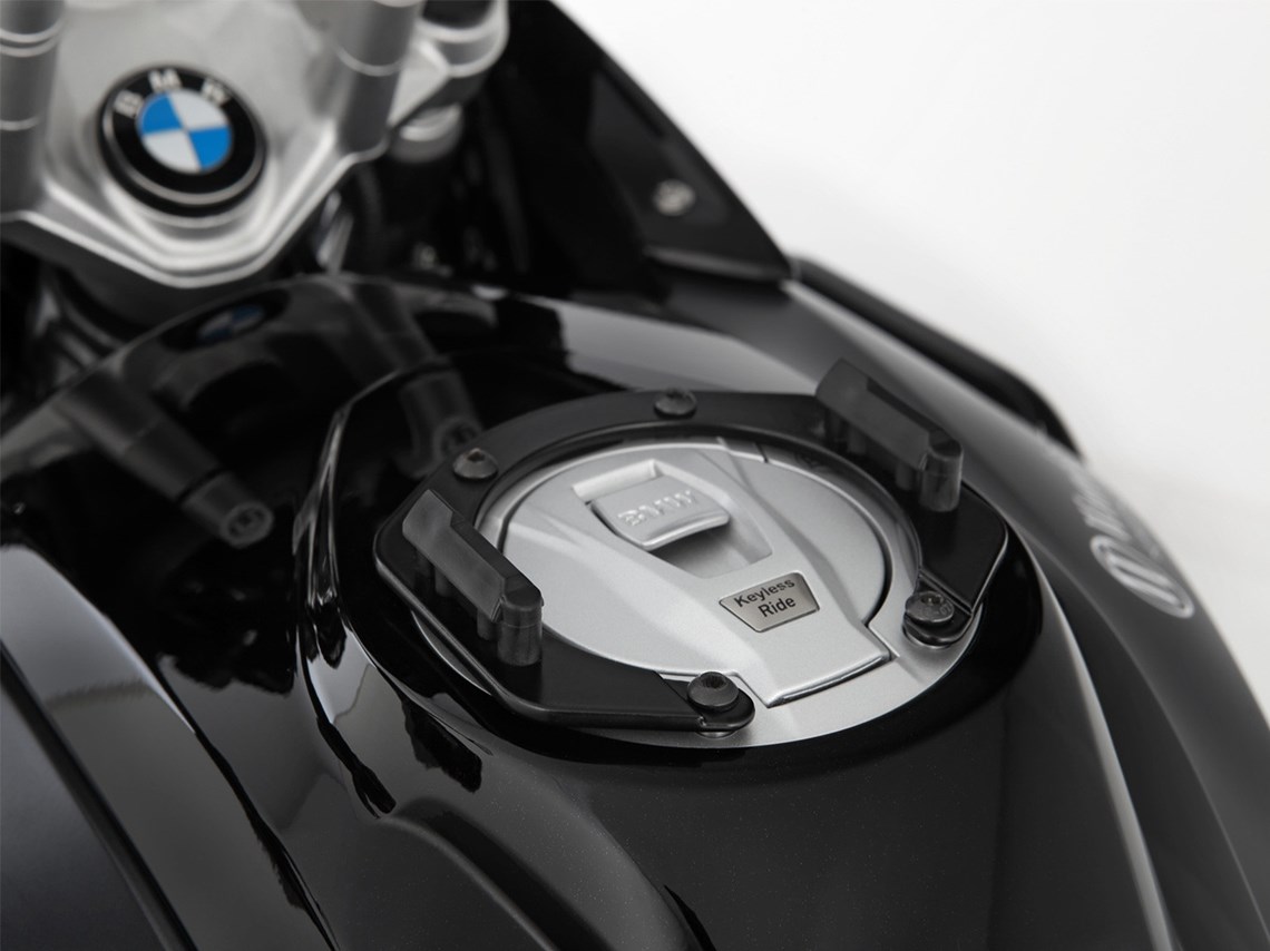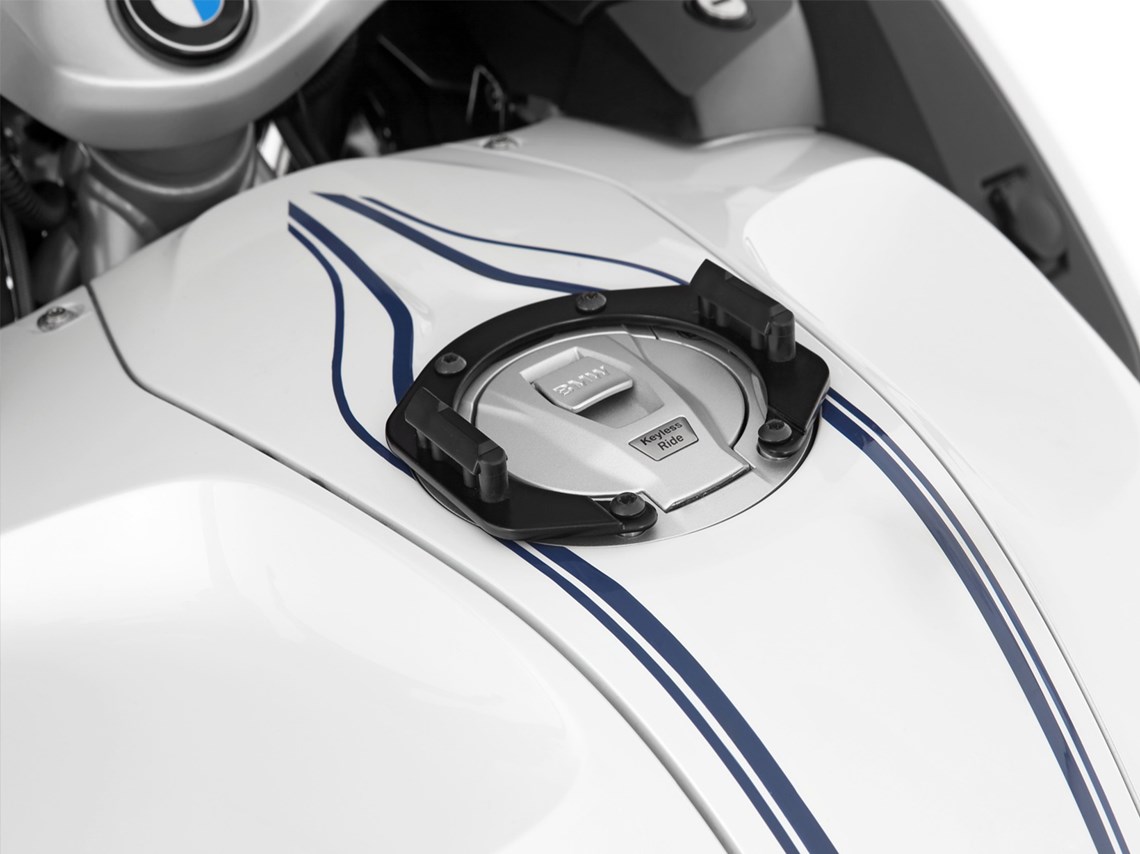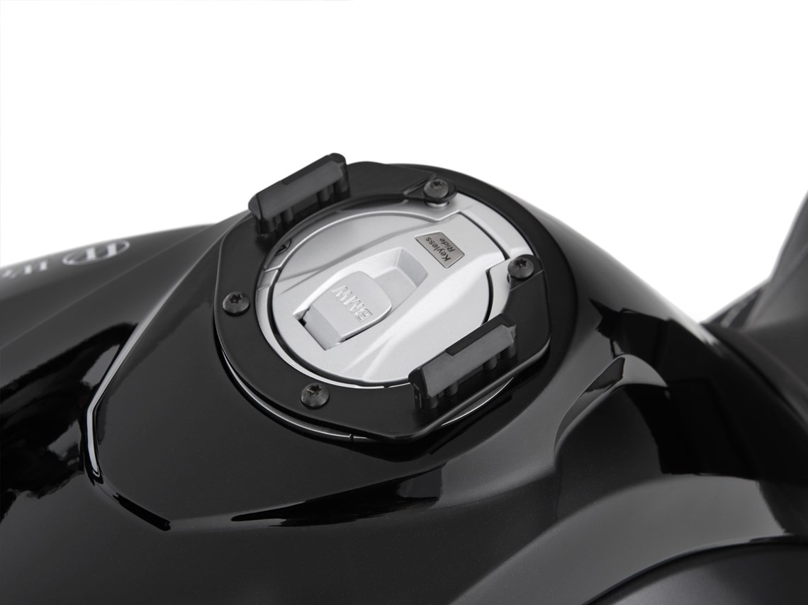 Model-specific Click System tank ring forms the solid basis for secure, mechanical locking of the Click System tank bag. To attach the Click System tank bag is inserted from above into the two guides of the tank ring until the lock closes automatically. With a strap on the tank bag, the lock can be released with a pull. In this way, the tank bag can be removed in no time at all - for example to refuel.