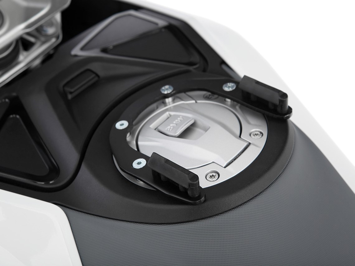 Model-specific Click System tank ring forms the solid basis for secure, mechanical locking of the Click System tank bag. To attach the Click System tank bag is inserted from above into the two guides of the tank ring until the lock closes automatically. With a strap on the tank bag, the lock can be released with a pull. In this way, the tank bag can be removed in no time at all - for example to refuel.