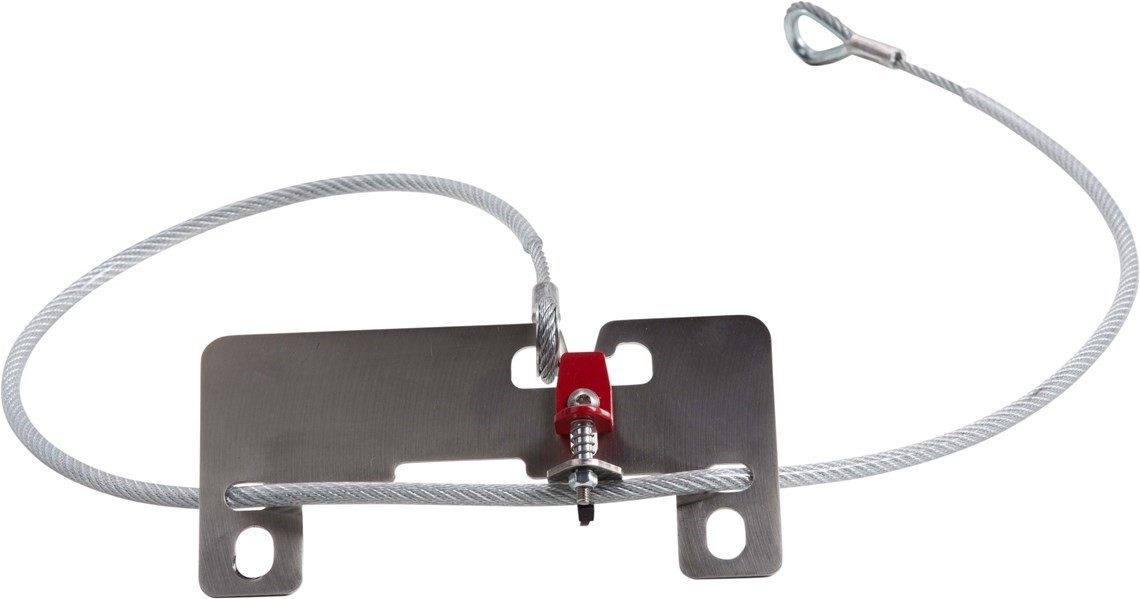 To secure a helmet: unlock and remove the seat as normal, unhook one end of the steel rope using the spring-loaded release, thread through the helmet's chin bar or metal D-ring, then re-attach the free end of the rope to the bracket and refit and lock the seat.