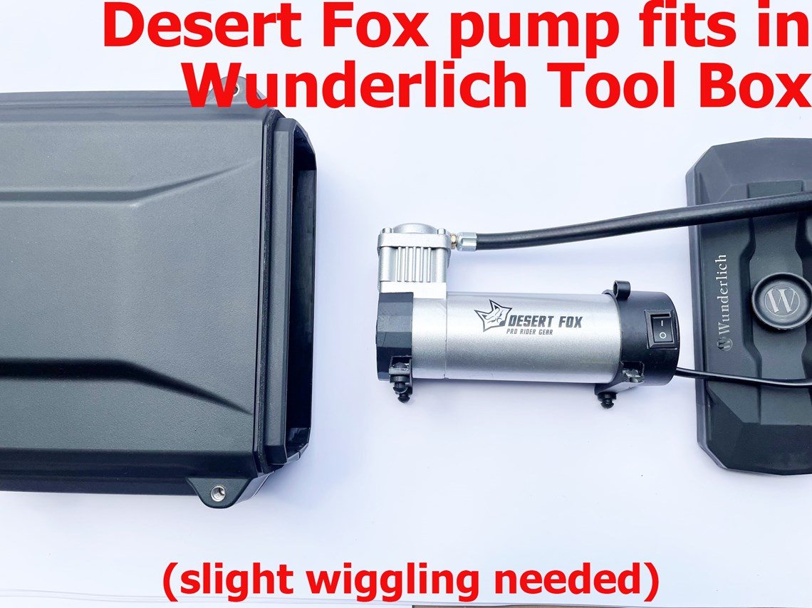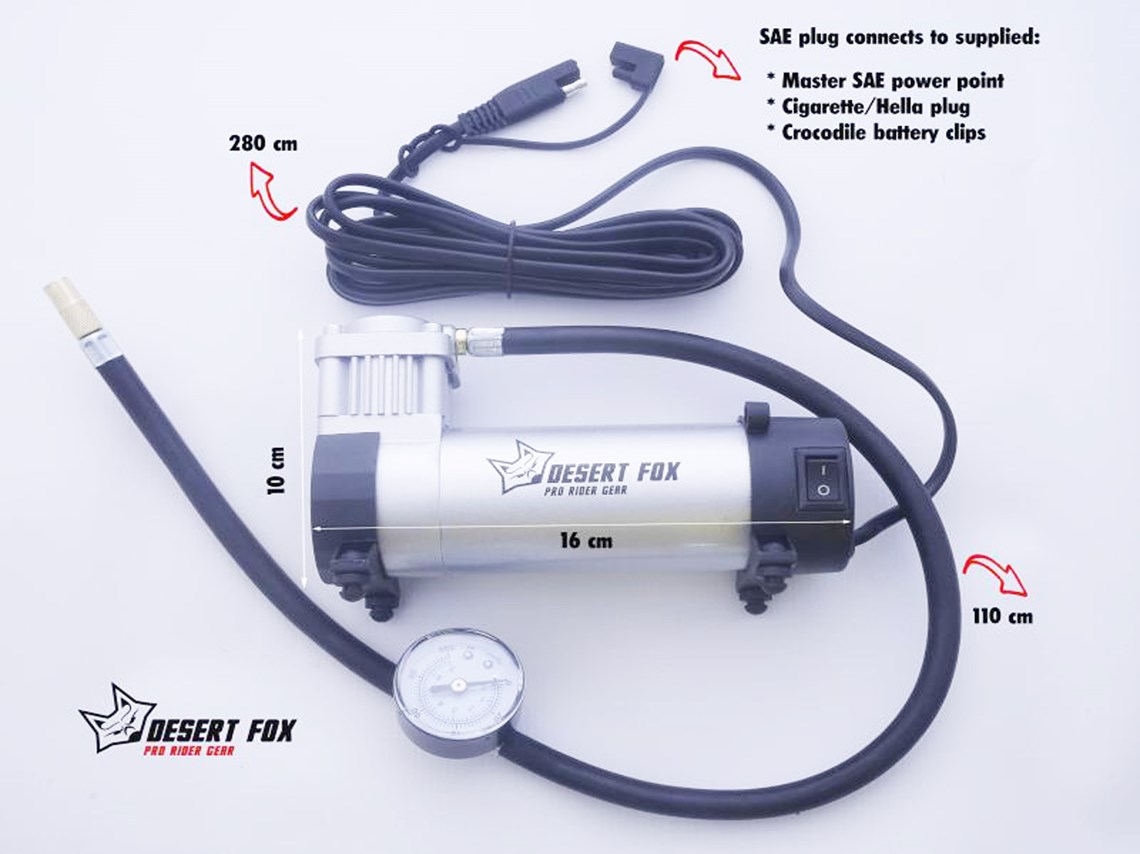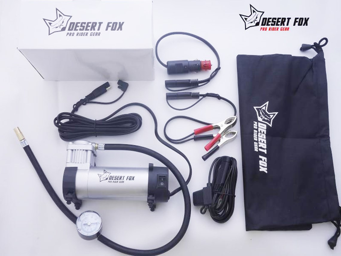 It makes sense then to ensure that you have a motorcycle air pump that can meet the demand when you need it most . The Desert Fox 12V air compressor is an affordable compact motorcycle tyre pump for dual sport bikes and sport-touring. Now flat tyres are a breeze to re-inflate with this compact high capacity air compressor.