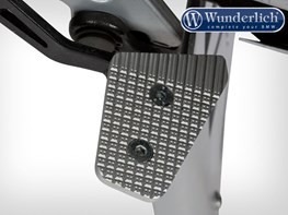 In its original form the footrest area is unfortunately rather small, which all too often presents a safety risk. If your boot is resting too far towards the edge of the footrest, you have to bend it awkwardly to reach the brake. With this lever enlarger installed, a wet boot slipping off the lever tip or treading on thin air belongs in the past.