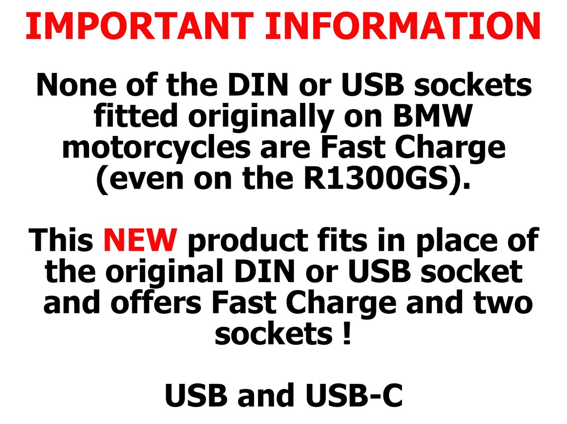 All modern BMW bikes come equipped with a DIN like socket or USB socket to power accessories. With our Dual USB-A and USB-C conversion you can have a Fast Charge multiprotocol charger with USB socket AND a USB-C socket. Whether your phone is an iPhone, Samsung or many other brands, the charger adapts the fast charge feature automatically.