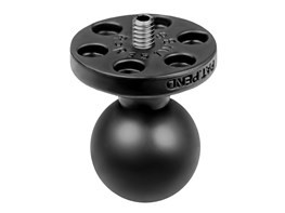 The universal composite camera base consists of a 1 diameter rubber ball, connected at right angles to a 1.25 round plate with a centered 1/4-20 thread. The plate adds extra support to the thread, by allowing the camera to rest on the plate it creates a stable connection with the camera.