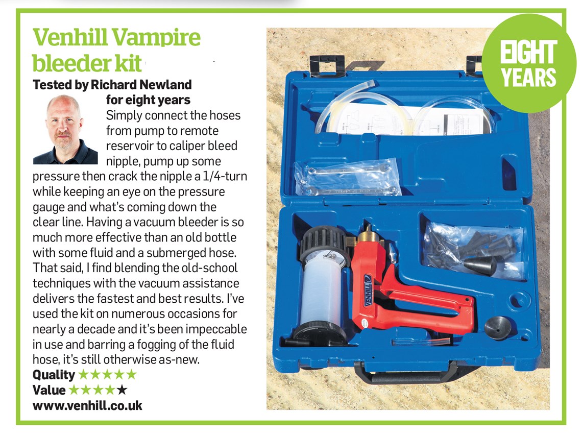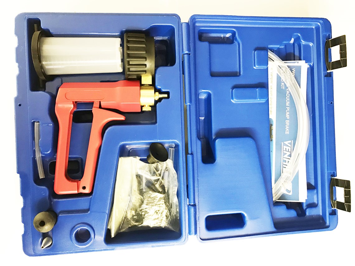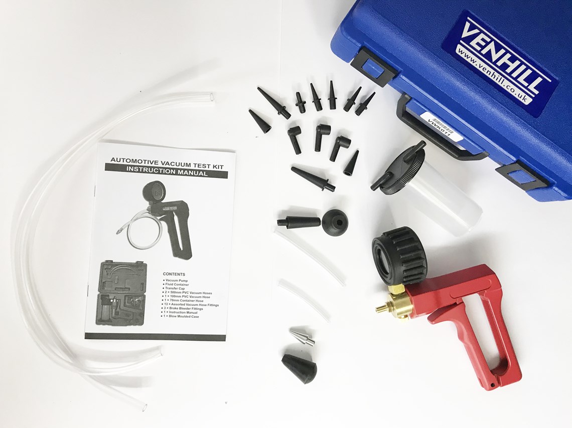 The Venhill Vampire vacuum pump brake bleed kit features a “pull style” handheld pump, with the use of a sealed collection chamber. It should work for all types of motorcycle brake systems. The bleed tube should be connected to your motorcycle brake calliper and the master cylinder reservoir topped up with brake fluid whilst bleeding. The kit comes supplied with all the clear tubes and adapters you will need to perform a consistent bleed on a wide range of motorcycles and other vehicles. The included adapters are flexible rubber so you can force them over various bleed nipples to fit tightly.