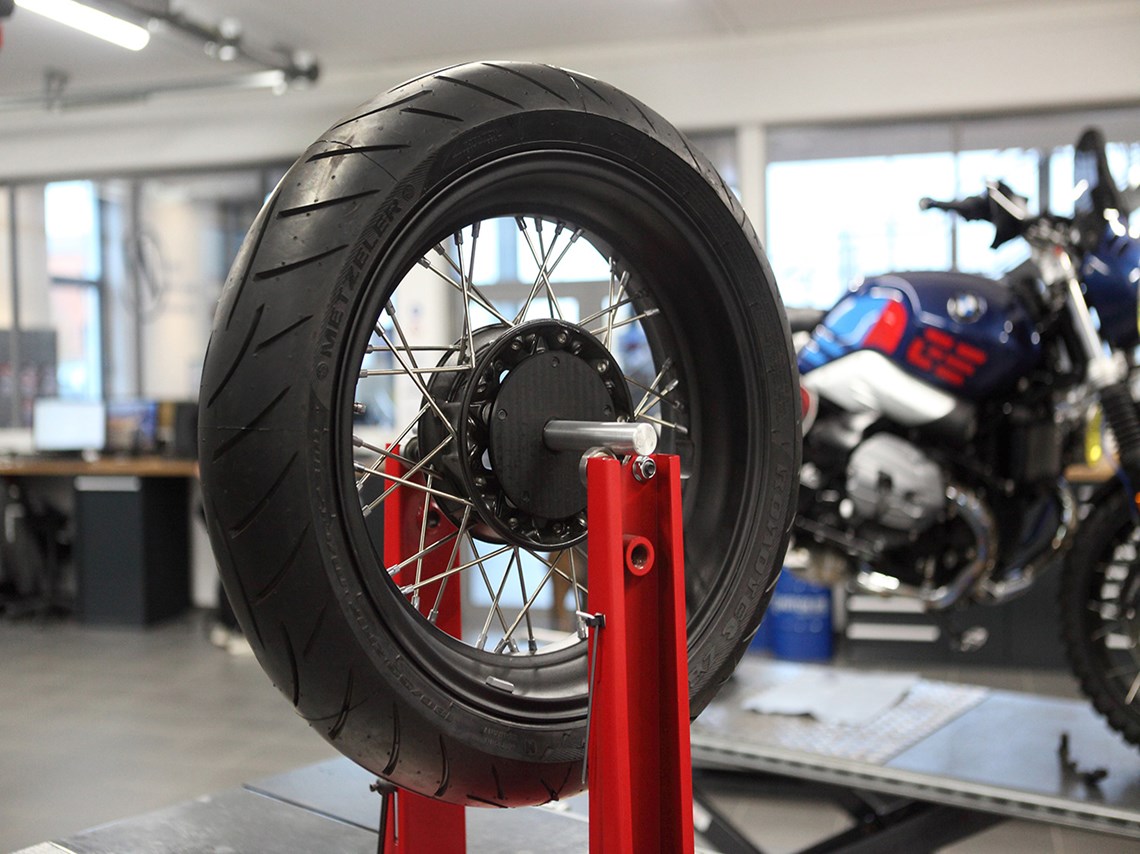 The wheel hub of the rear wheel rim has a diameter for which there are no standard axle mounts for balancing. Now there is one! Our balancing adapter fits precisely into the wheel hub, centres it and is screwed to the flange five times on the rim. The 25 mm axles of all common balancing machines or balancing stands can hold the rear wheel safely and without play. We include a suitable axis (ø 25 mm, length 420 mm) with our balancing adapter.