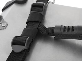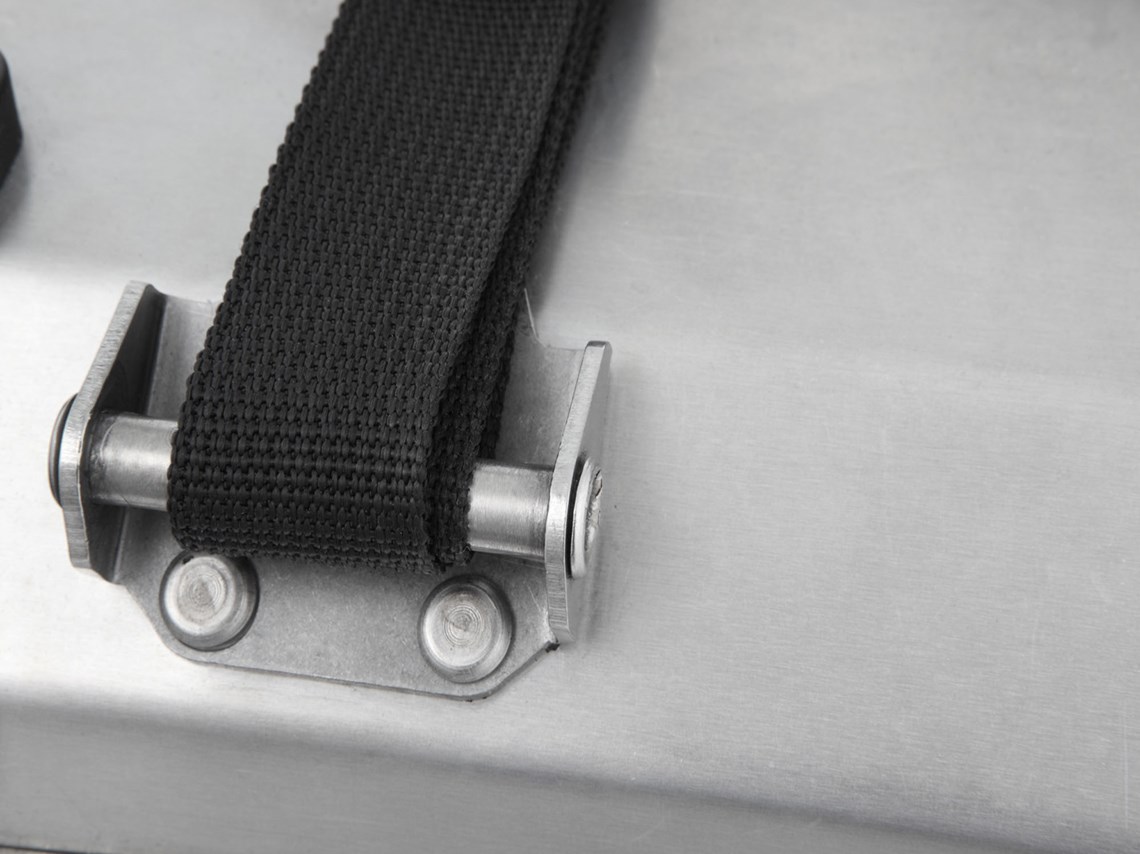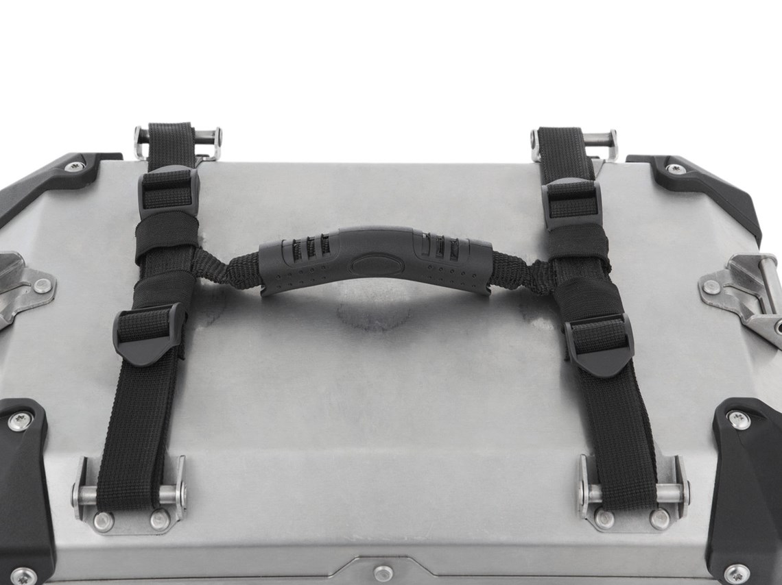With this handle system BMW aluminium cases can be carried comfortably from home to motorcycle or from motorcycle to hotel. The adjustable handle system is made from tear-resistant polyester fabric and is easily attached to the four lashing points. The ergonomically shaped handle is made of non-slip elastic rubber.