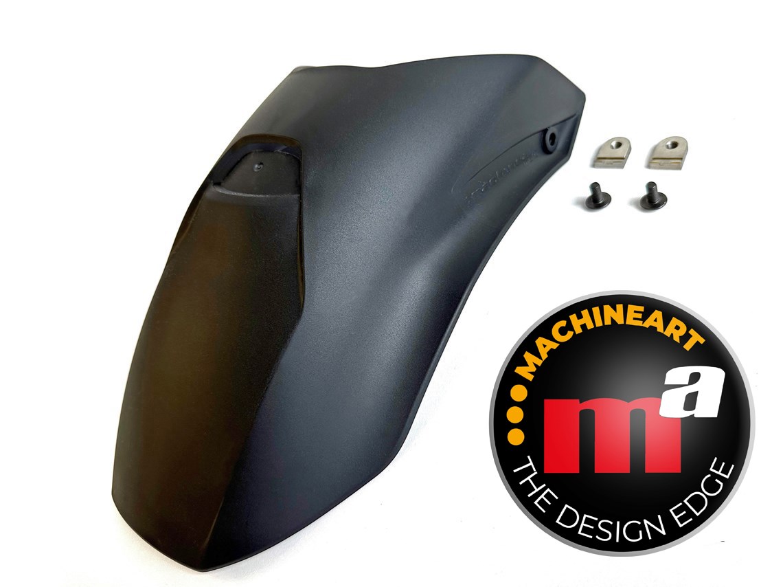 “Not only is it simpler to install, it looks beautifully integrated with the styling of the new GS and is transferable to another bike without leaving disfiguring holes behind, a benefit for resale value”. The Avant Fender Extender fits over the top of the fender and securely engages the tip of the stock R1300GS front mudguard with a unique moulded-in shoe. Two compression clamps grip the underside of the R1300GS front mudguard on both sides, drawn tight with T25 Torx Head screws. The characteristic flared wing shape widens the splash coverage area without looking wide.