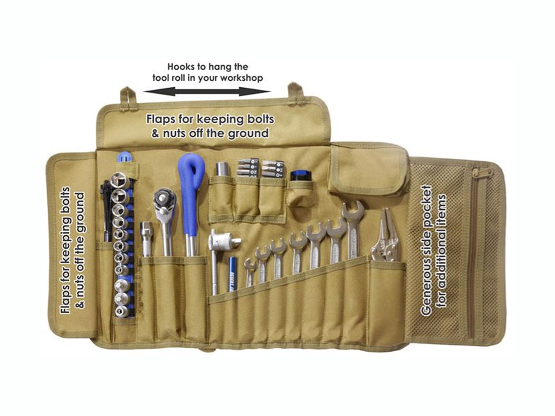 Supplied in a tough tool roll that has additional storage compartments.