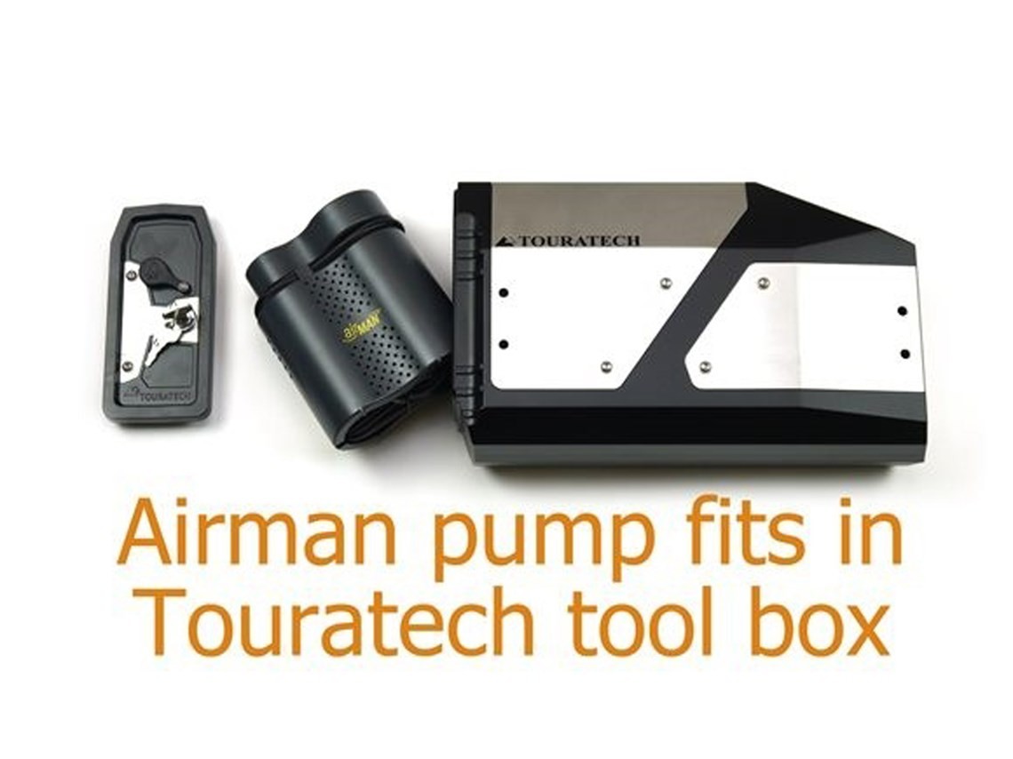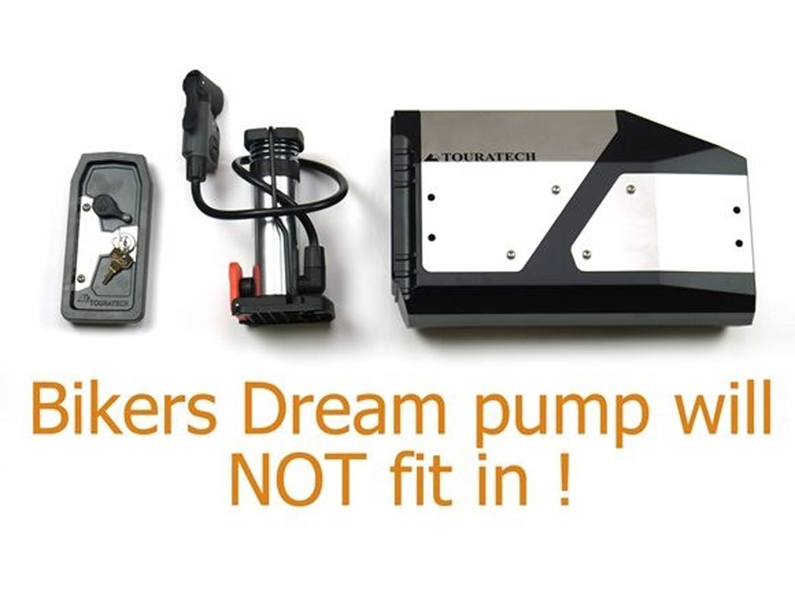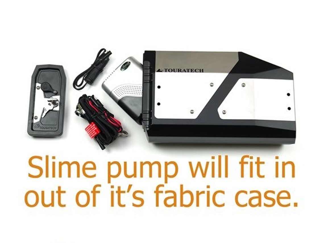 * Slime pump (part number TES-STI1) will fit in - out of its protective case the pump and all of the accessories will fit into the Touratech tool box.