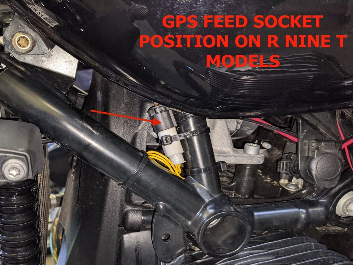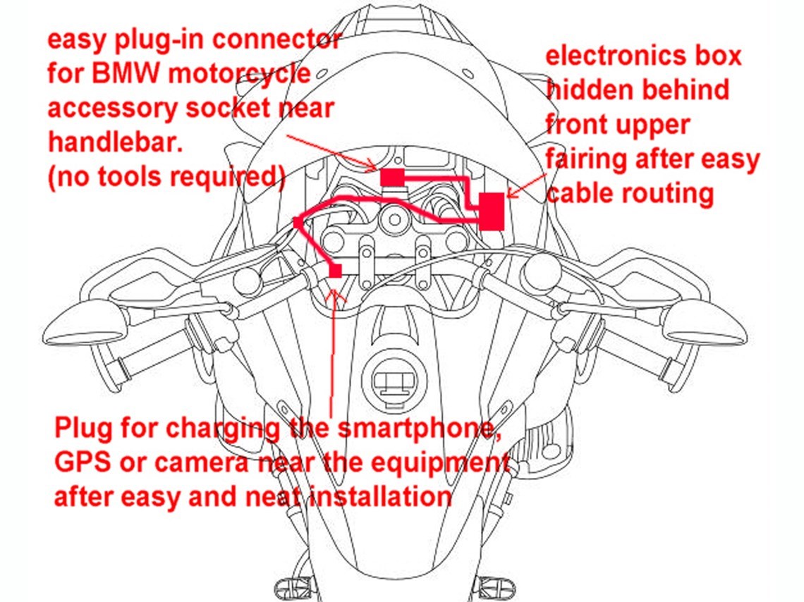 BMW motorcycles feature a factory installed connector to power GPS. This socket is located in the front area as in the example of a R1200GS as shown in the image or for F series bikes it is located near the battery. This cable will plug straight into this socket providing a safe and watertight installation. You just need to remove the protective cover and insert the cable connector. Then route the cable and secure it with simple tie-wraps up to the place where the gadget to be charged is to be.
