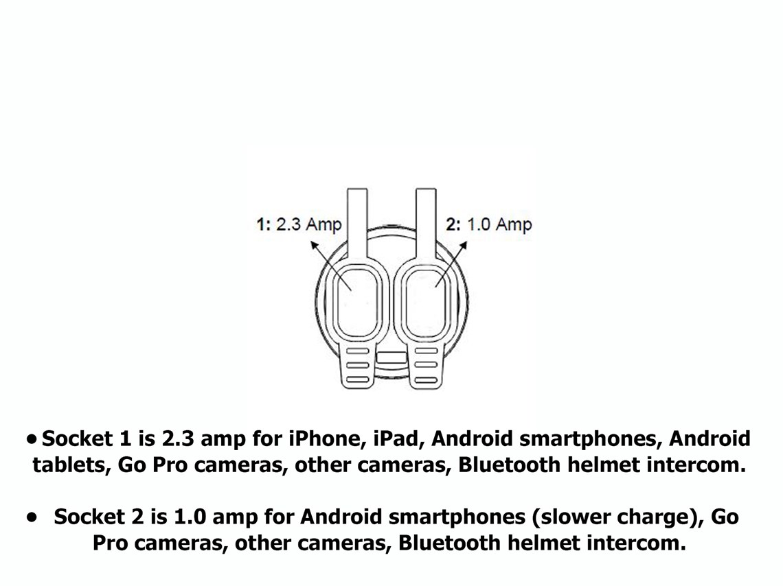 • Socket 1 is 2.3 amp for iPhone, iPad, Android smartphones, Android tablets, Go Pro cameras, other cameras, Bluetooth helmet intercom.