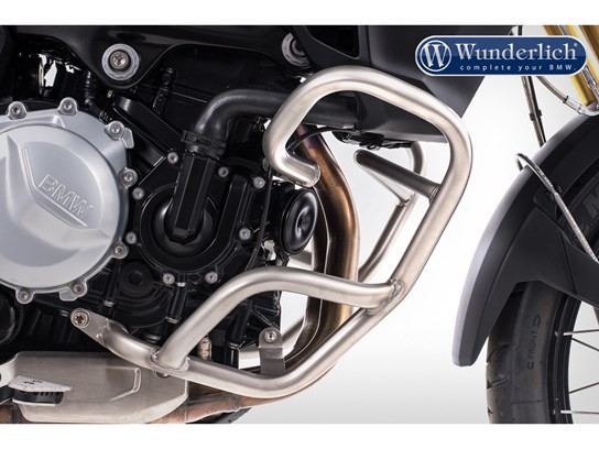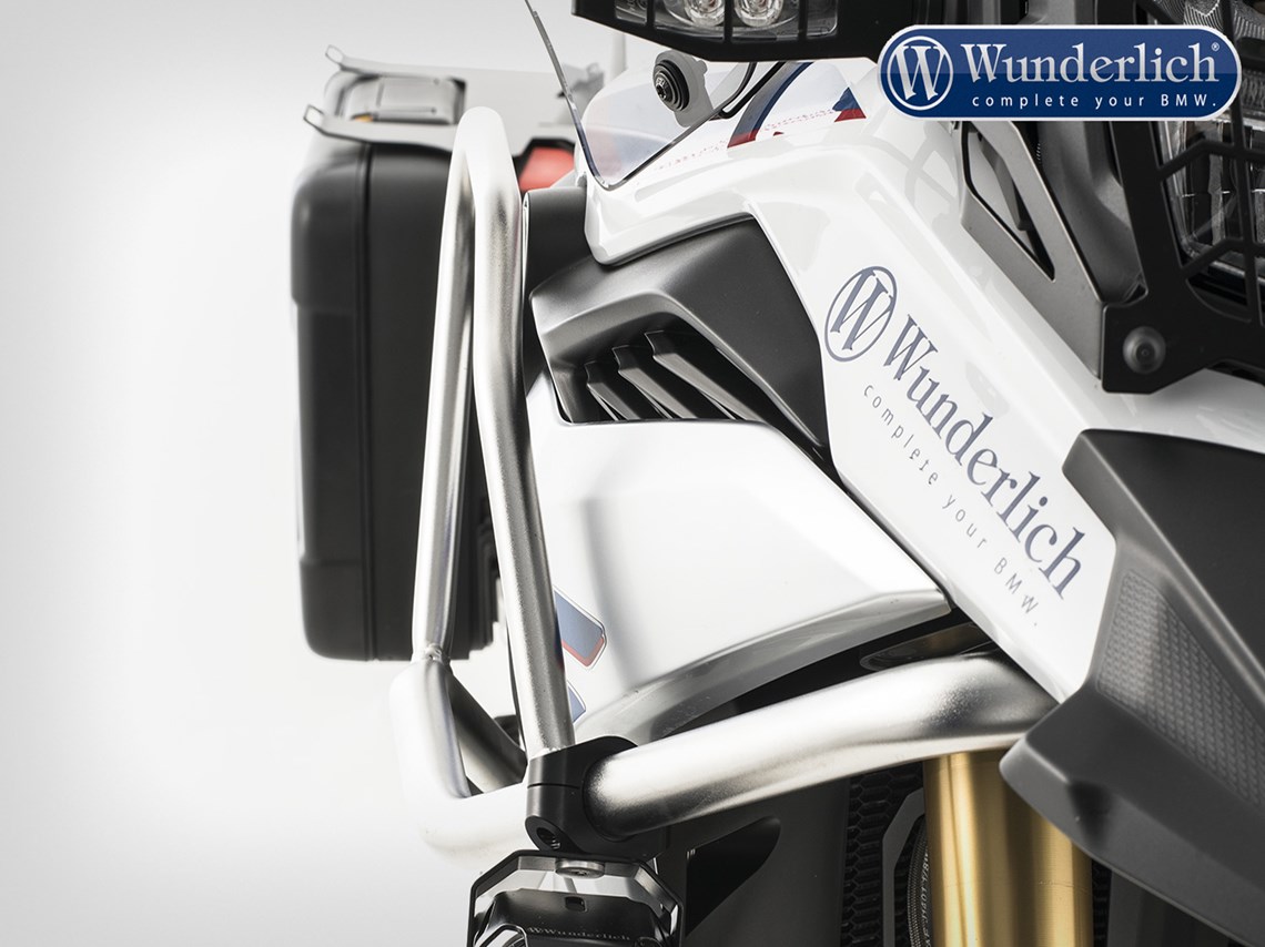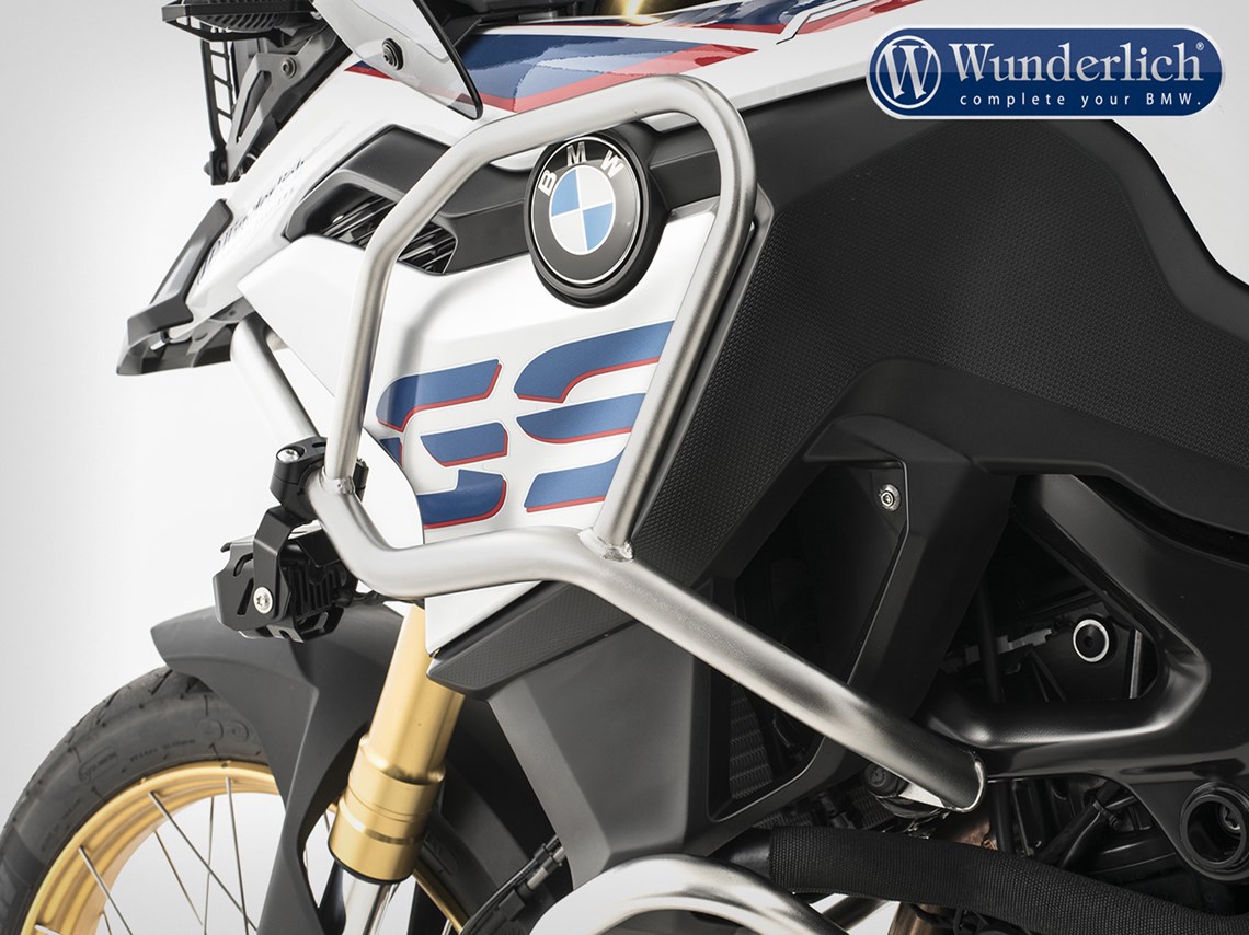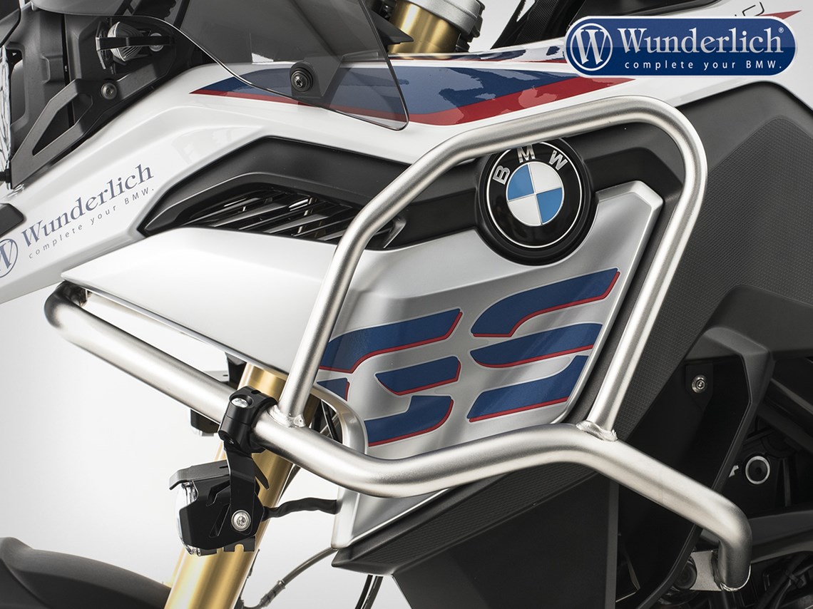 We have developed this new and professional tank protector especially for the F850GS . Fits with the Wunderlich engine bars and protects the upper parts of the fairing very effectively. The resilient mounting points absorb the occurring forces reliably and prevent from costly damage which might arise from tipping over after a crash.
