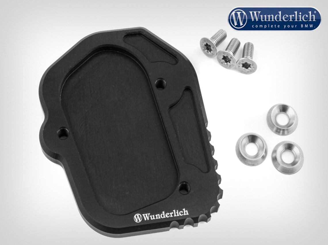 Precision machined enlarger plate is manufactured from 8mm thick aluminium alloy. The shape of the side stand enlarger is designed so that the stand will still fold away as before, but the area of the stand is INCREASED BY 100%.