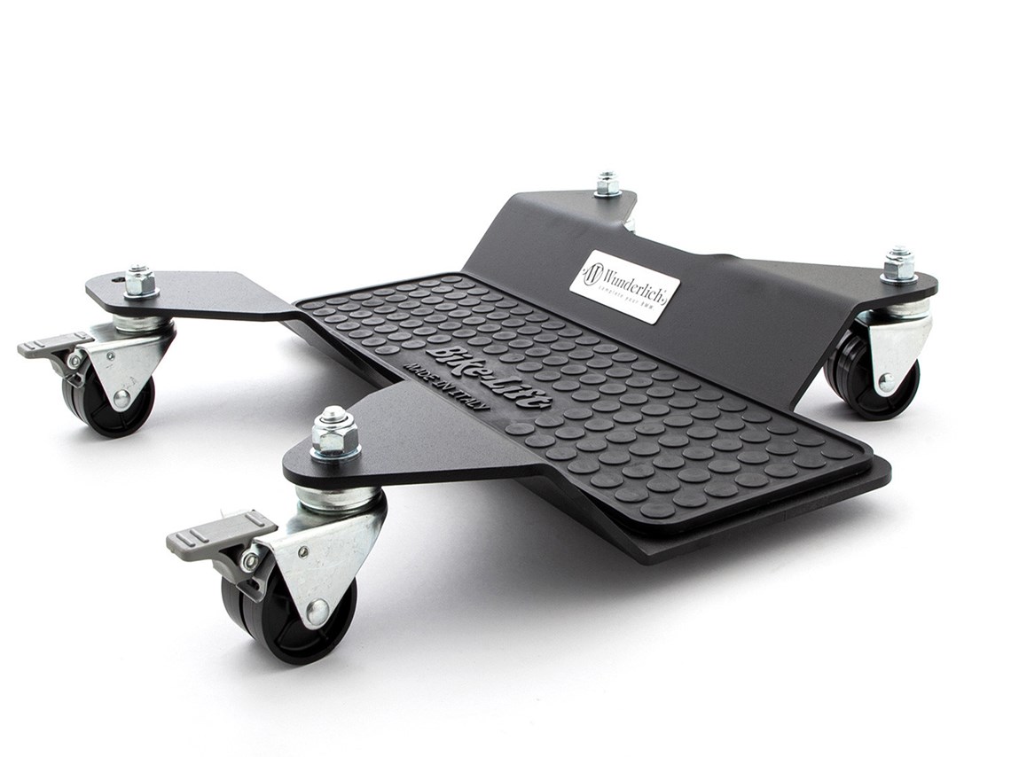 The Easy Park allows you to easily move your bike while parked on the center stand. This is especially useful for placing your bike in the corner of the garage when it’s not being ridden. When it’s time to ride though, it also makes getting your bike pointed out the door easier. This is a high quality, heavy duty tool made of BLACK FINISH steel plate. It has heavy duty locking casters and is made to last a lifetime.