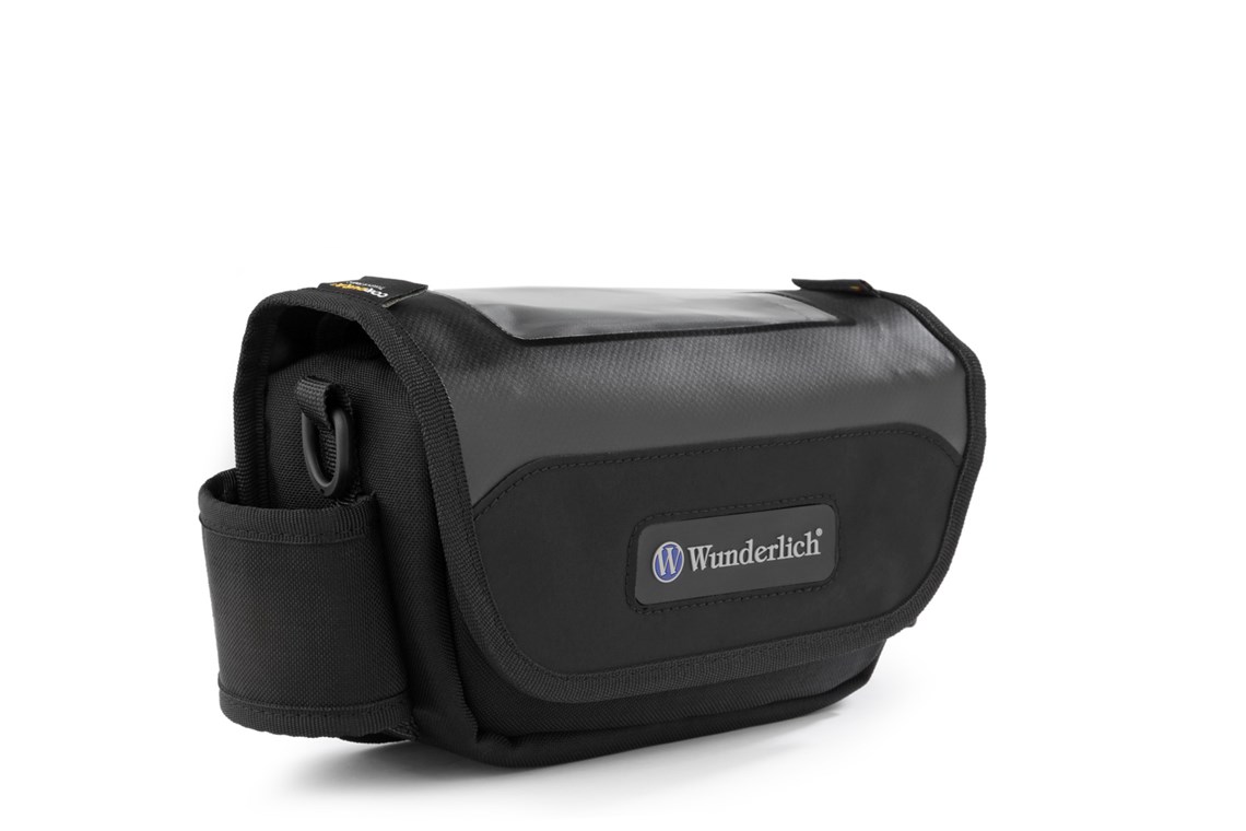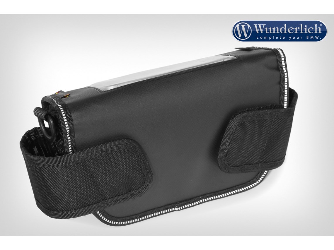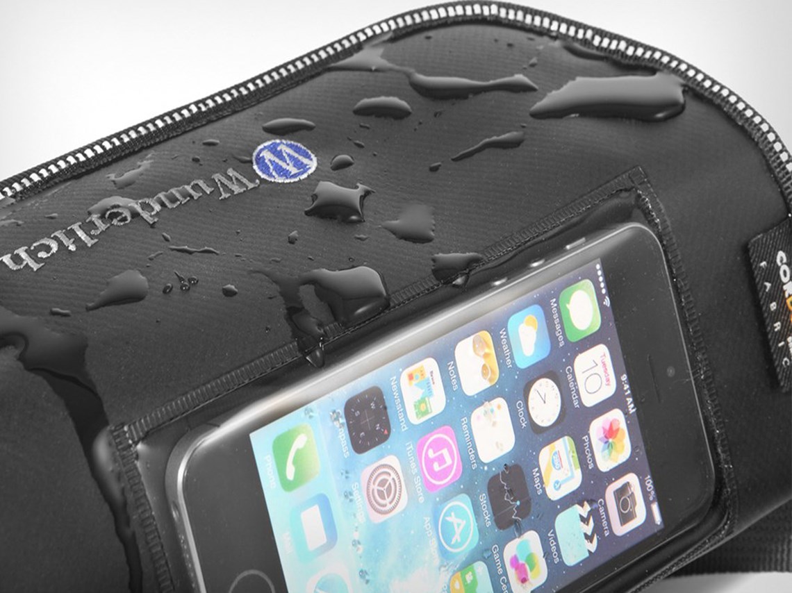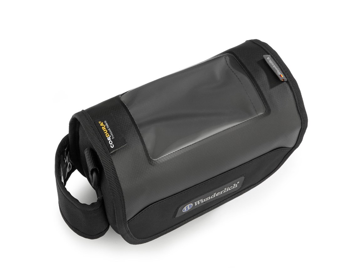 This bag is an evolution of our current handlebar bag, which is a big step by us towards water-tightness. We've swapped the top and the whole flap for water-tight truck tarpaulin material and welded the mobile phone pocket. This provides perfect protection for the mobile phone.