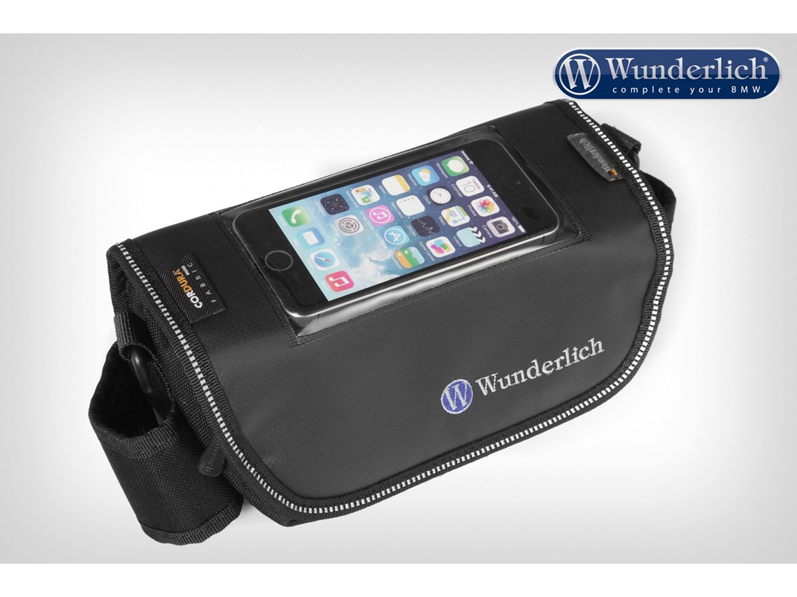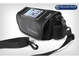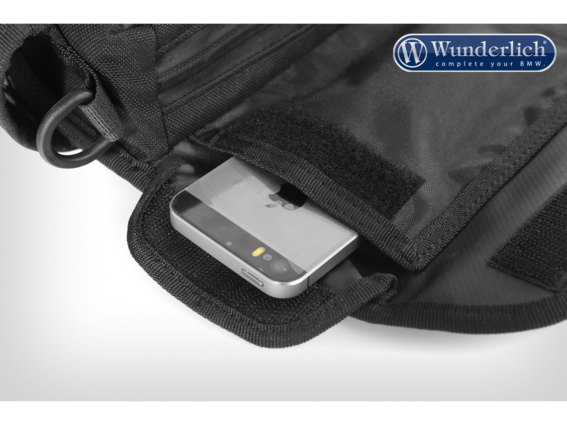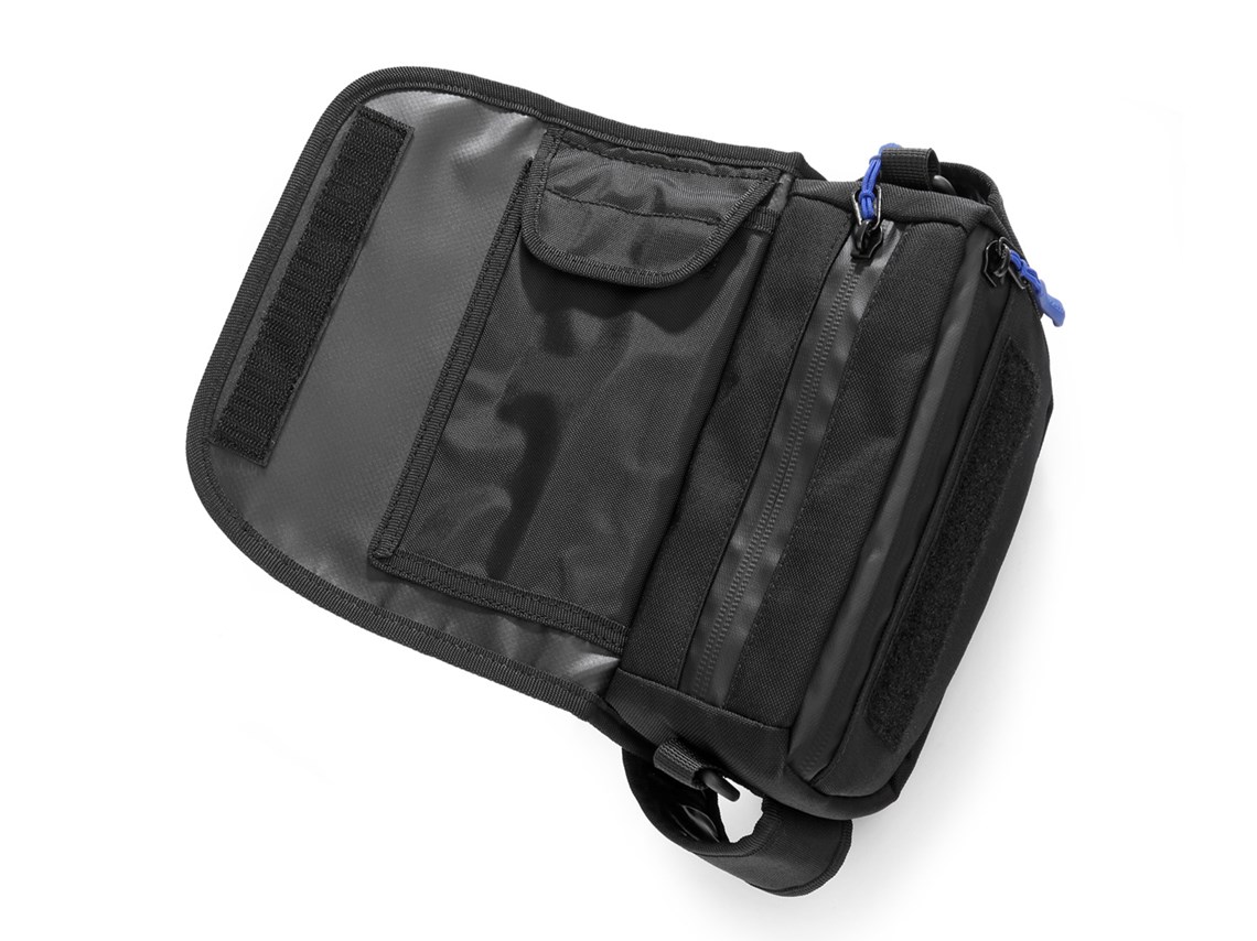 This bag is an evolution of our current handlebar bag, which is a big step by us towards water-tightness. We've swapped the top and the whole flap for water-tight truck tarpaulin material and welded the mobile phone pocket. This provides perfect protection for the mobile phone.