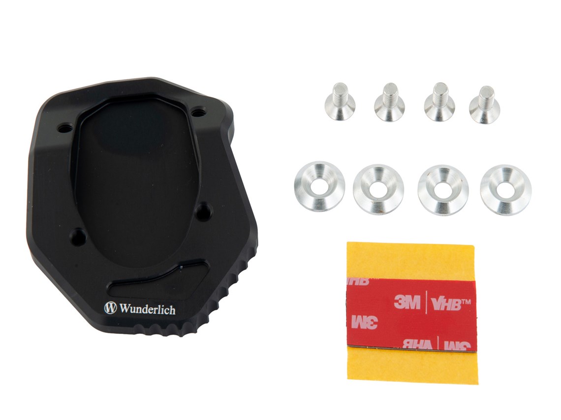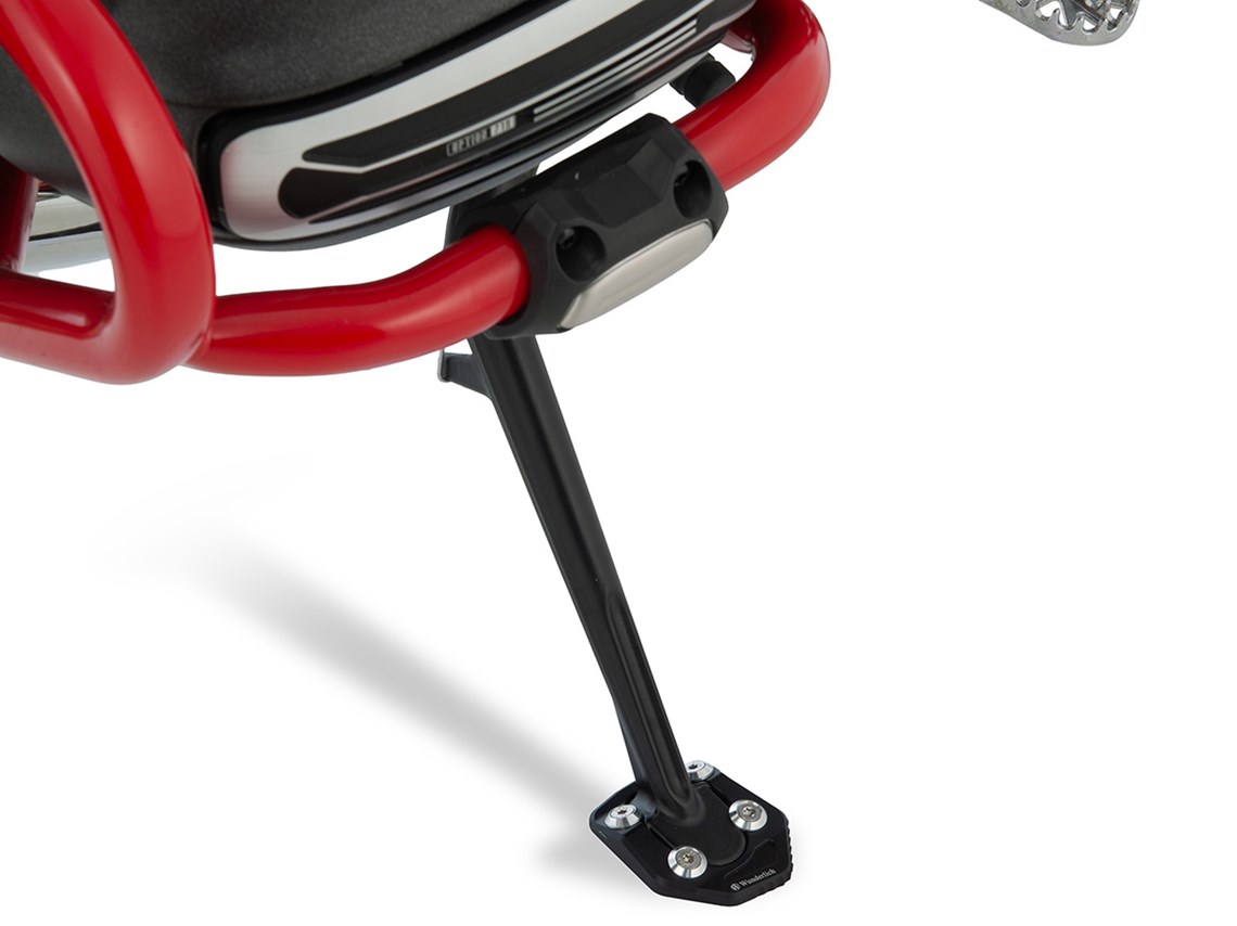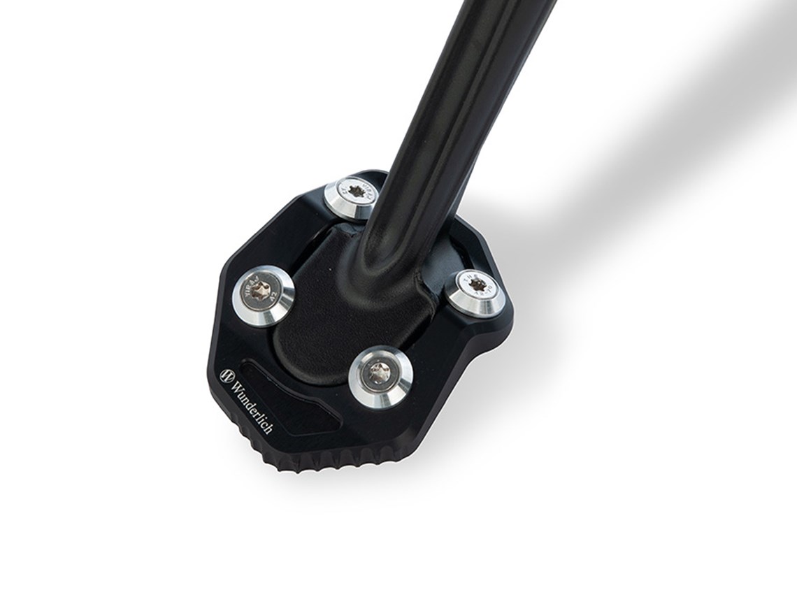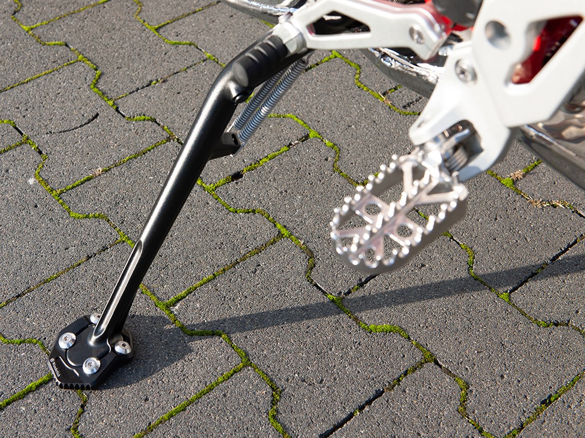 Precision machined enlarger plate is manufactured from 8mm thick aluminium alloy. The shape of the side stand enlarger is designed so that the stand will still fold away as before, but the area of the stand is INCREASED BY 100%.