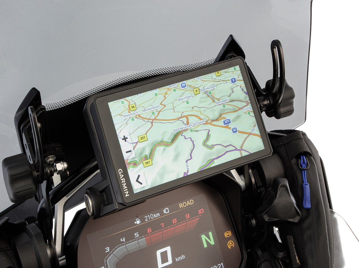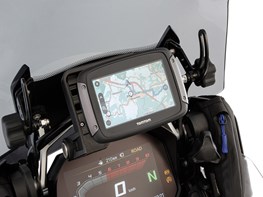 Navigation devices such as a TomTom Rider or the Garmin XT and XT2 can be mounted directly on the front mount of the navigation adapter. The power supply is plug & play via the attached contacts. This saves you having to lay and connect an extra power supply. Once the navigation system has been installed, it is connected to the bracket to prevent it from being stolen.