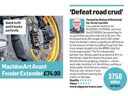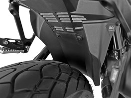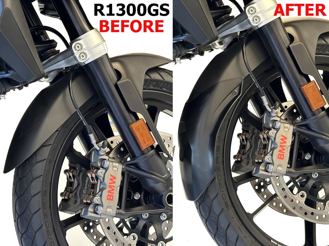 BMW have provided a minimal rear mudguard for the R1300 Adventure but it is insufficiently long and wide to capture mud and water spray thrown forward onto the suspension and to the sides onto riders legs. This new MudSling® increases the surface area to each side by up to 3, and downwards by a full 7 to cover and protect the outside of the Paralever arm.