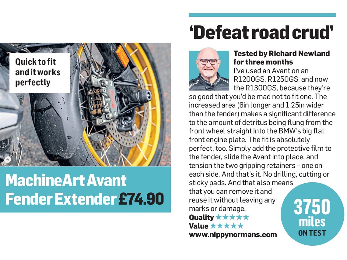 The standard front mudguard of the R1300 Adventure is both shorter and pointier at its trailing edge than the previous generation GS making the exposed painted surface of the front engine case even more vulnerable to stone damage.