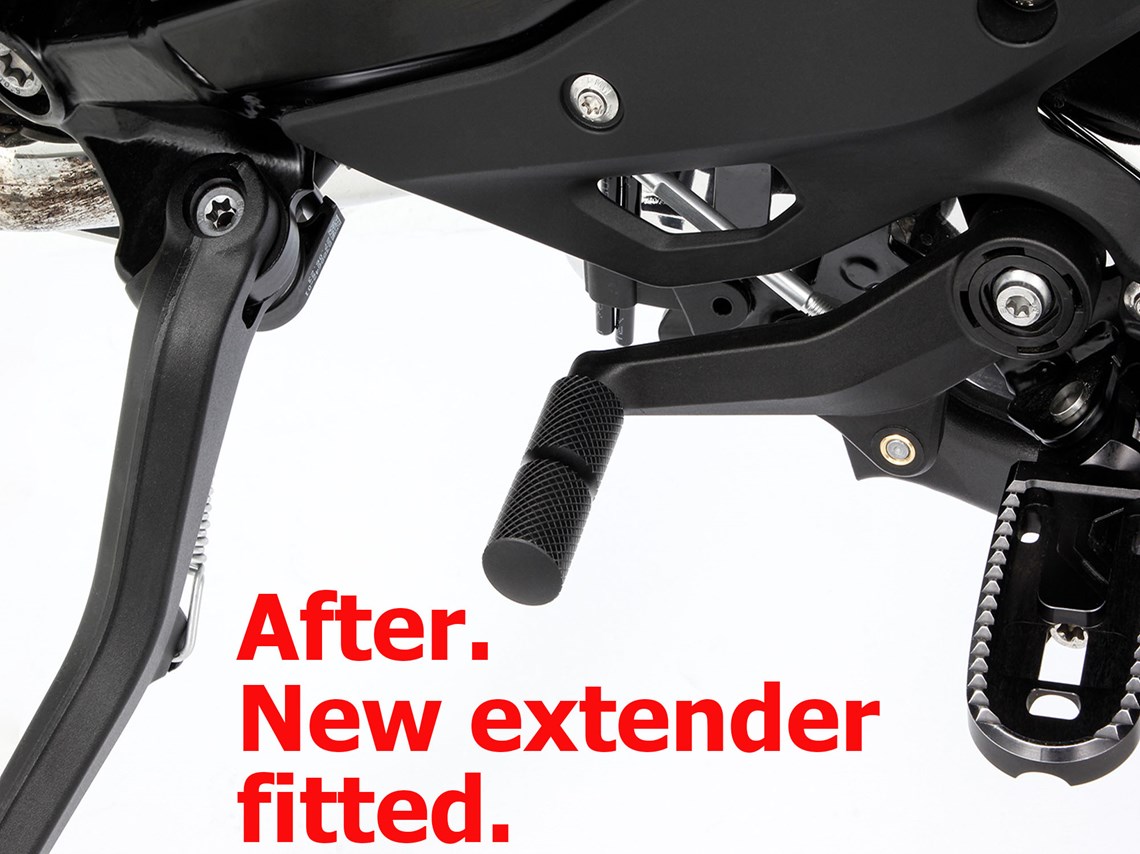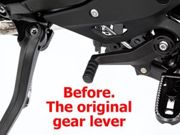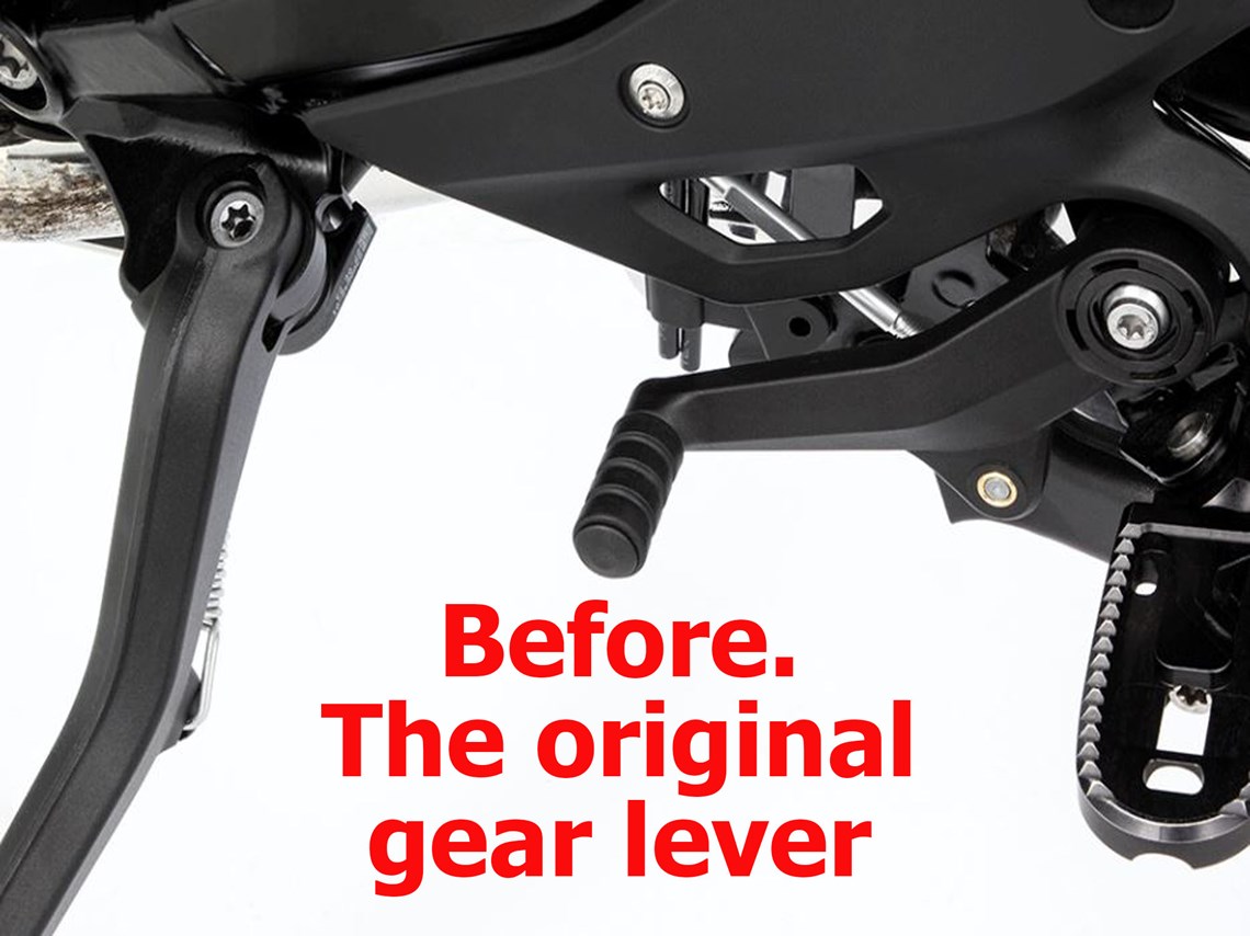 The standard gear lever is too delicate, too short in length and too thin in diameter. You keep looking for it, but sometimes you hit it inaccurately and unfortunately the tip of your boot is bound to slip.