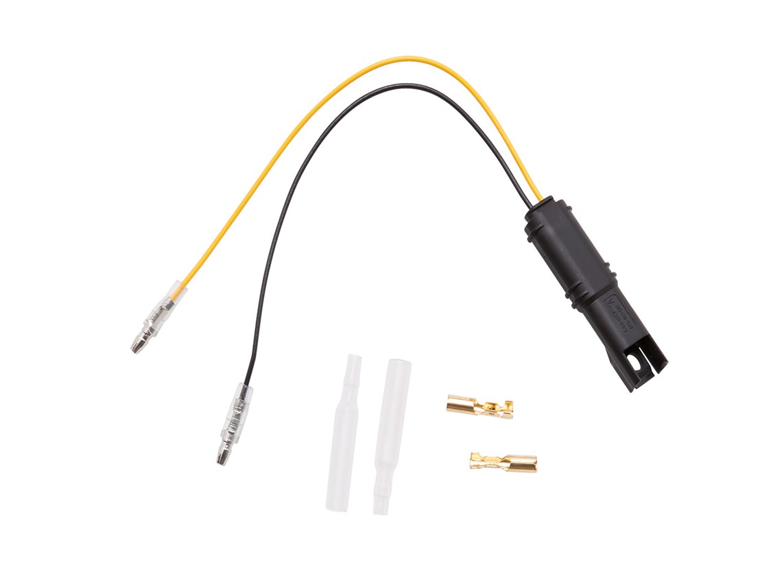 This adapter makes it easier to convert the front indicators (e.g. handlebar end indicators). It is simply plugged into the motorcycle in place of the original front turn signal connector and then connected to the cables of the accessory turn signal with the help of practical round connectors. Complete!