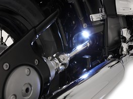 One of the fascinating highlights of the BMW R18 series is the open rotating shaft of the cardan drive. It is even more fascinating to perfectly stage the nickel-plated shaft in the twilight and in the dark. Illuminated with LED white light, the nickel surface and the rear universal joint come into their own and provide an unexpected wow effect!