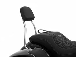 Thanks to the comfortable upholstery the Wunderlich sissy bar for the Bagger not only makes it safer, more comfortable and more relaxed to travel, it also emphasizes the attractive rear end of the R18 with its high-quality design. The design follows the style of the bike perfectly. To match the frame, the construction of the sissy bar is black powder-coated and finished with clear varnish. With an eye for detail, we have used the same high-quality cover material that the seat is covered with. Our upholsterer joined the sections with the appropriate seam pattern, i.e. matched to the seat. Subtle and selected!